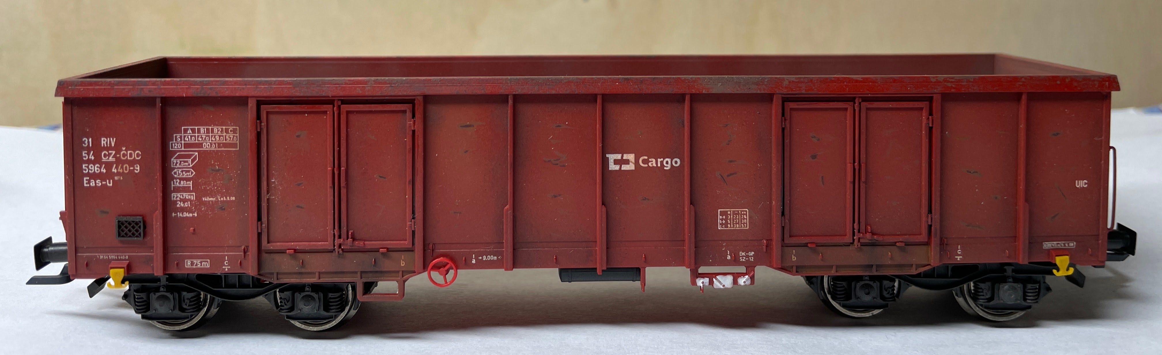 2) Podle potřeby a uvážení celý vůz zesvětlím (vyšisuju) washem TSC212 White Oxide, aby barva nebyla tak sytá. Wash naředím a stříkám. Stejně jsem dělal i svoji 742.701, viz https://tt120.zlamal.cz/lokomotiva-742- ... ptu-kuber/, porovnej fotky skoro na konci článku.