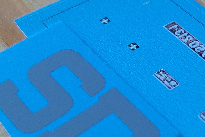 Foto ukazuje originální stav. Je vidět, že na žel. obtisku je vrstva laku hrubá a flekatá, letecký obtisk je hladký a homogenní.