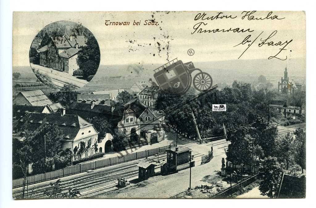 Jarda H. píše:To hank61 : ještě k Trnovanům, historická pohlednice - pohled na "pravou" část stanice (příjezd od Prahy, původní dvojkolejný přejezd), staniční budova je směrem doleva, za kolejema