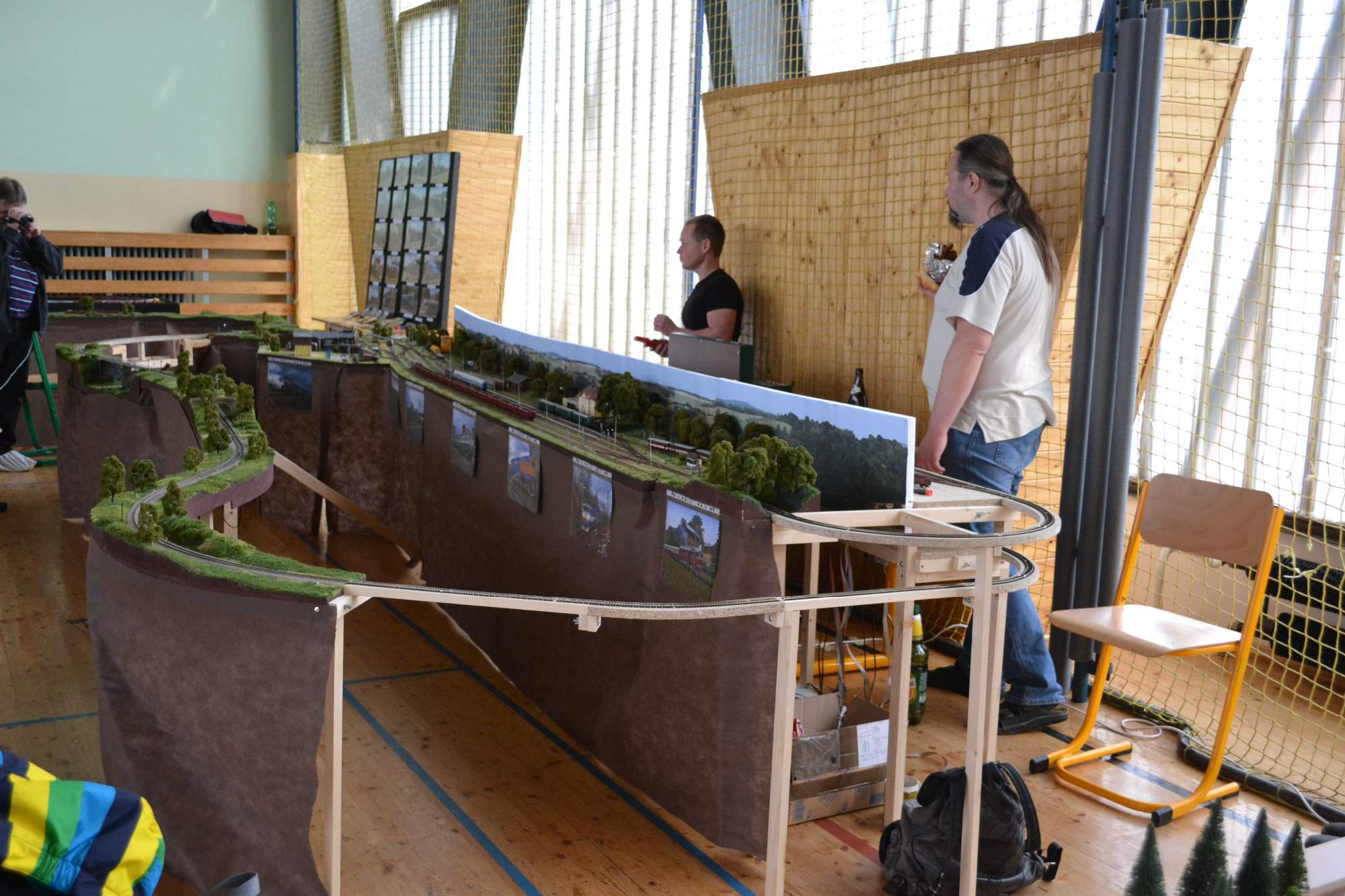 Předmětné kolejiště je Miroslava Vlčka (pán v černém triku). Na fotce s polokulisou je stanice Březová, která je nyní už dost přestavěná. Nicméně v této konfiguraci už dost let stavěno není, jelikož Miroslav Vlček a Josef Němeček svoje modulovky spojili dohromady, k nim se přidali další (i já) a vystavují jako MPK (moduláři plzeňského kraje).