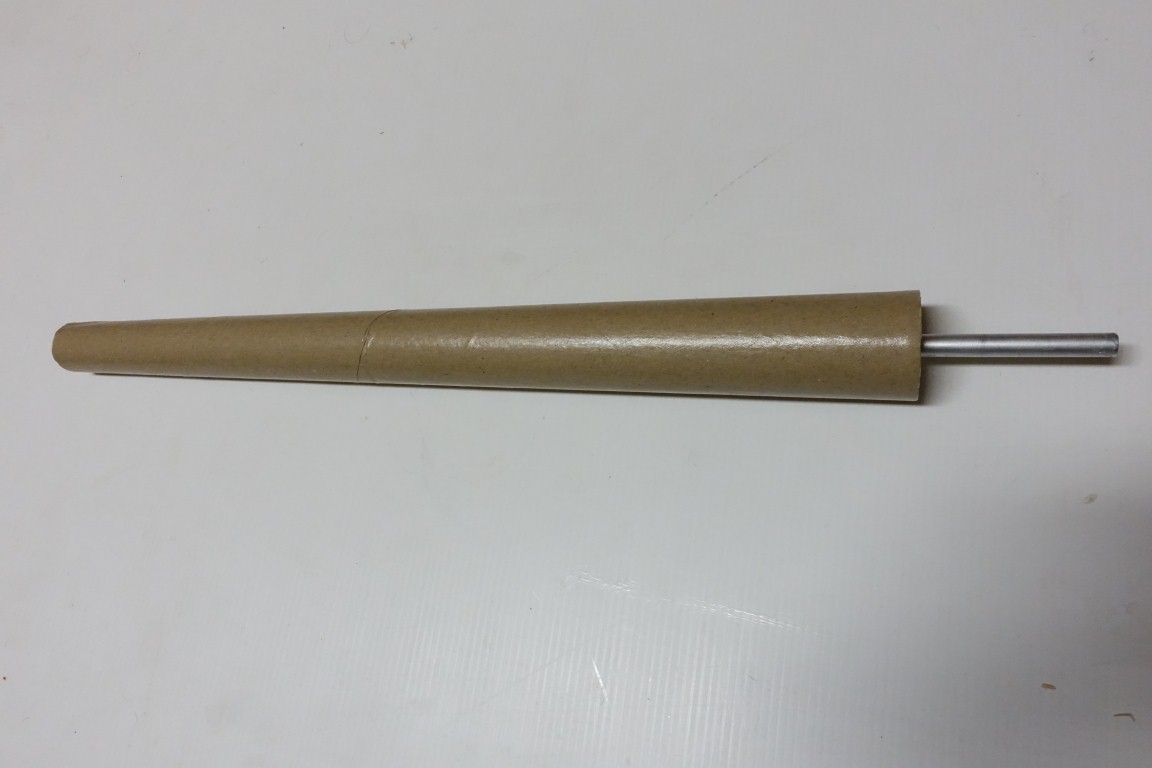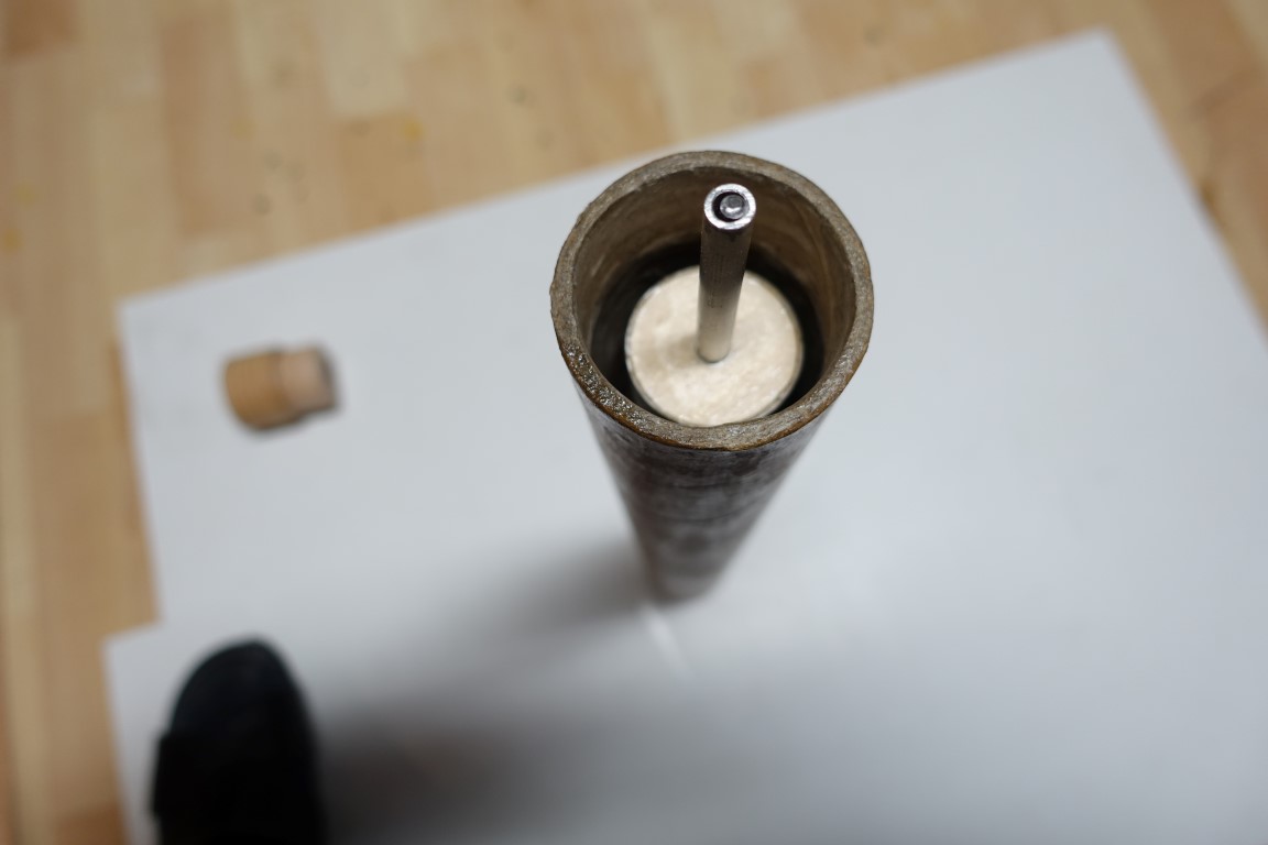 Protože by komín v trubce mohl kvedlat, vyřešil jsem to středovou zaváděcí tyčkou. Ta bude z odšpuntované trubky trochu vyčnívat. Na ní se komín nasune hlavicí napřed a uzavře druhou zátkou. Na konci zaváděcí tyče je gumový doraz. Ten dosedne dovnitř hlavice komínu a tudíž se nebude dotýkat jeho povrchu. Zátka komín zajistí proti příčnému i podélnému pohybu. Tím bude komín dokonale chráněn před přepravními otřesy.