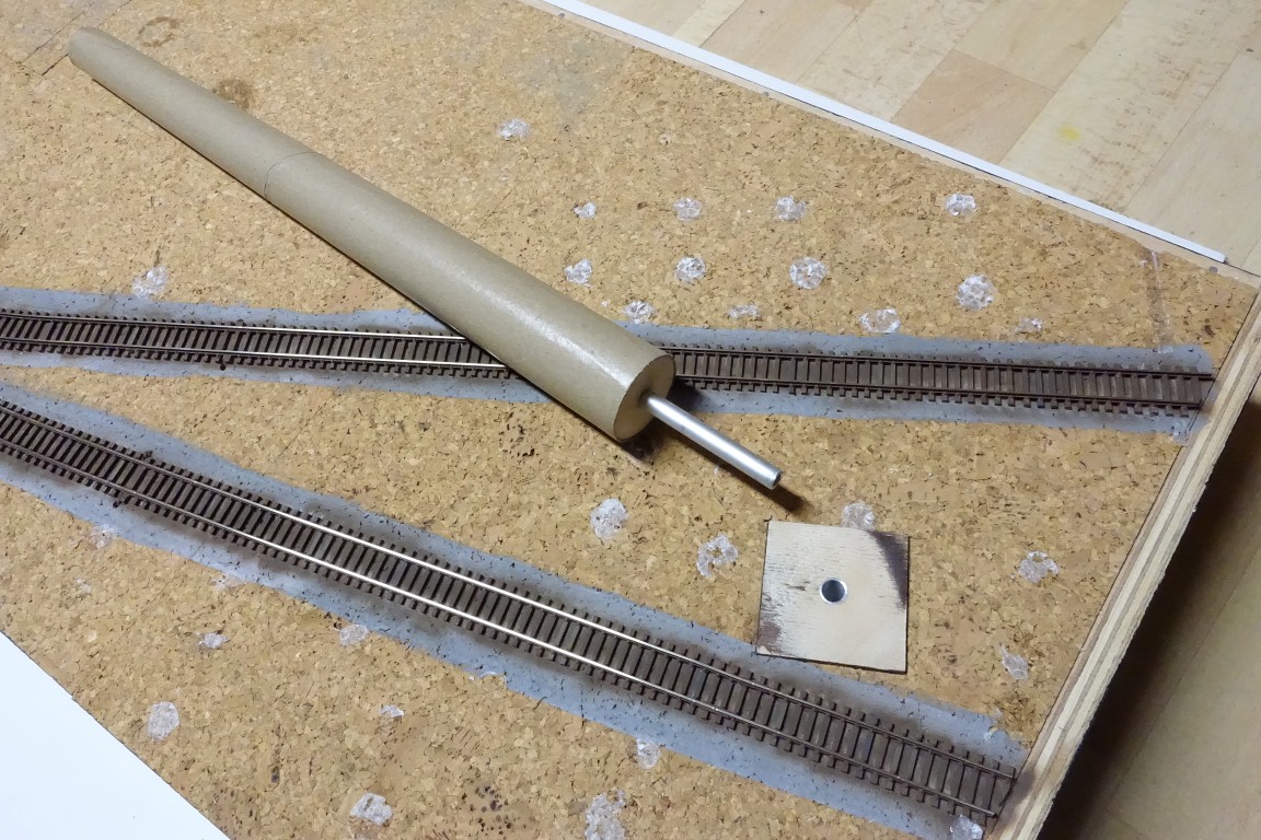 Podestu komínové šachty jsem ustavil cca do výšky temene kolejnic. Musím počítat s chybějícím terénem. Tímto by byly základní práce týkající se komínu na modulu hotové. Teď budu patlat už jen komín. Do šachty jde zasouvat lehce a pěkně lícuje.