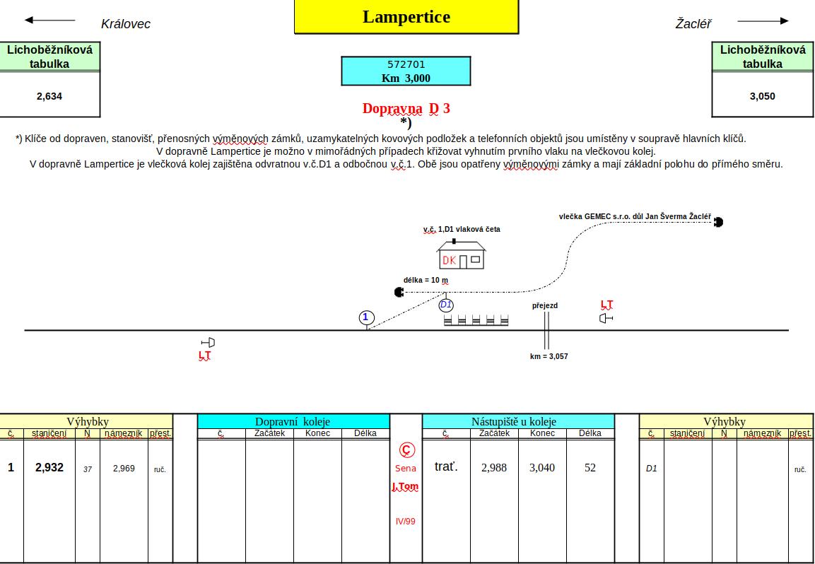 "...bavíme se o existenci staniční koleje, na které se bude vykonávat ohlašovací povinnost (a tu jaksi odbočky z principu nemají)." Jak je vidno z přiloženého plánku, dopravní ani jinou staniční kolej v roce 1999 neměli ani v Lamperticích... Ohlašovací povinnost se evidentně (aspoň teoreticky) mohla vykonávat na traťové koleji (vlaky Královec - Žacléř) i na koleji vlečkové (vlečkové vlaky btw podle vzpomínek kolegy, žacléřského rodáka Trainmaniaka, zajížděly z vlečky do dopravny Žacléř, kde teprve docházelo k předávkám zátěže). Další plánek z roku 2018 už nicméně jedinou dopravní kolej uvádí: Je ohraničena na královeckém zhlaví námezníkem výhybky č. 1 a na žacléřské straně koncem nástupiště u této koleje.