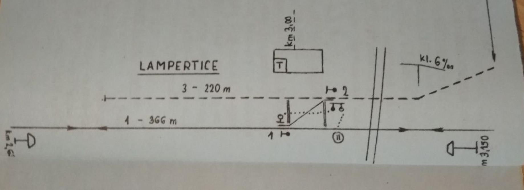 Pokud jde o Lampertice, tak kromě článku ze Světa železnice nemám nic jiného než plánky z databáze SENA. Nejstarší je z r. 1999 (viz dole) a už tehdy dopravna vypadala tak, jak jsem tu jednou publikoval. Morriss Zapp napsal: "...bavíme se o existenci staniční koleje, na které se bude vykonávat ohlašovací povinnost (a tu jaksi odbočky z principu nemají)." Jak je vidno z přiloženého plánku, dopravní ani jinou staniční kolej v roce 1999 neměli ani v Lamperticích... Ohlašovací povinnost se evidentně (aspoň teoreticky) mohla vykonávat na traťové koleji (vlaky Královec - Žacléř) i na koleji vlečkové (vlečkové vlaky btw podle vzpomínek kolegy, žacléřského rodáka Trainmaniaka, zajížděly z vlečky do dopravny Žacléř, kde teprve docházelo k předávkám zátěže). Další plánek z roku 2018 už nicméně jedinou dopravní kolej uvádí: Je ohraničena na královeckém zhlaví námezníkem výhybky č. 1 a na žacléřské straně koncem nástupiště u této koleje.