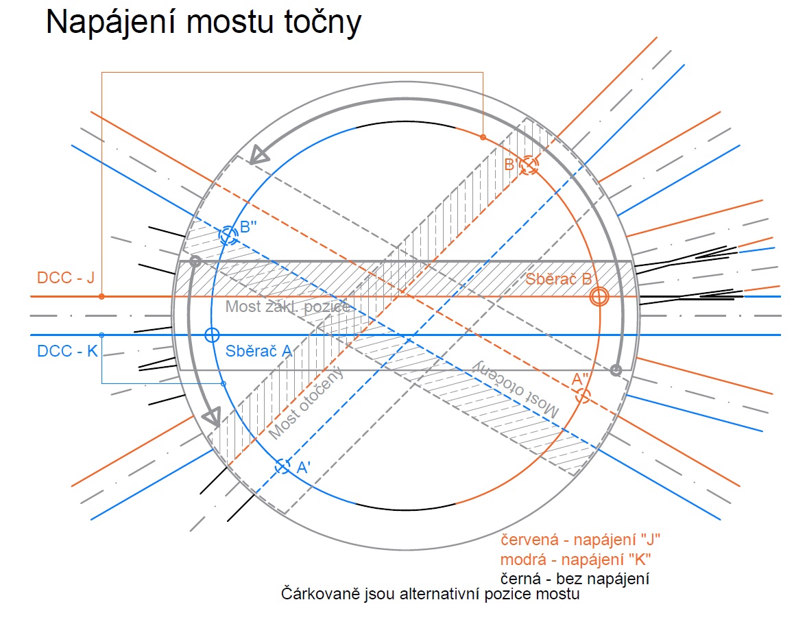 Michal Šuhajda píše:Ahoj, stavím točnu od základu. Aktuálně jsem ve stavu provozních zkoušek napájení. Vzhledem k uspořádání kolejí v depu jsem mohl použít velmi jednoduchý systém napájení kolejí na mostu točny. Přikládám schéma.