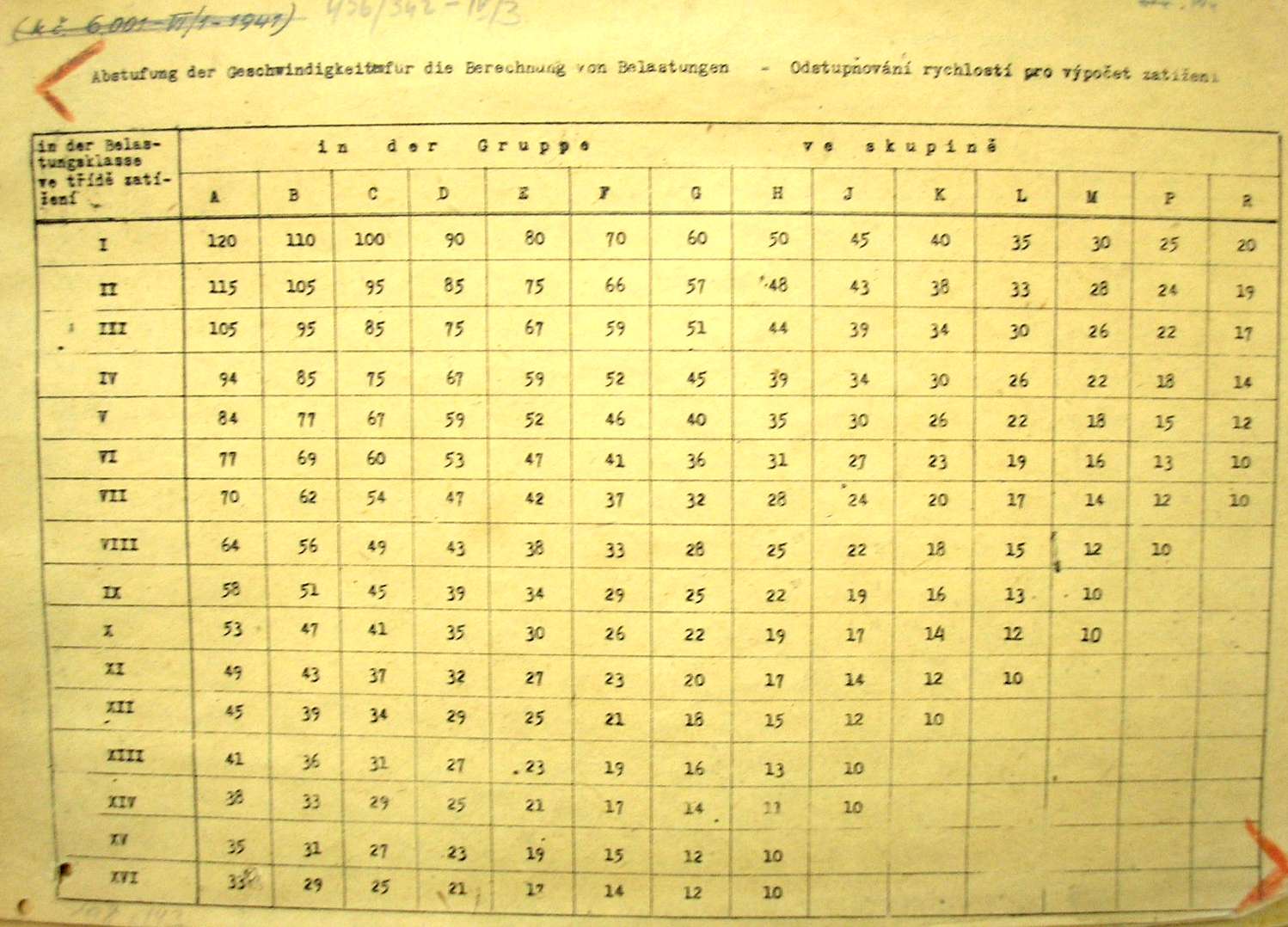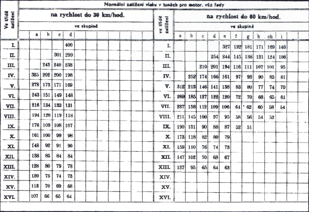 Tuto zátěžovou tabulku vypracovaly ČSD pro kořistní motorové lokomotivy T 334.0 (I. obsazení řady - ex WR 360 aka V 36) ještě před tím, než se lok. rozprchly na vlečky, tzn. někdy v období 1945 - 48. Je mi jasné, že a jak římská čísla označují třídy sklonu a že v tabulce jsou povolené zátěže v tunách, vím i to, že malá písmena v záhlavích sloupců znamenají rychlosti, ale chybí mi přiřazení konkrétních rychlostí jednotlivým písmenům a až i. Můžete mi to prosím pomoci rozklíčovat?