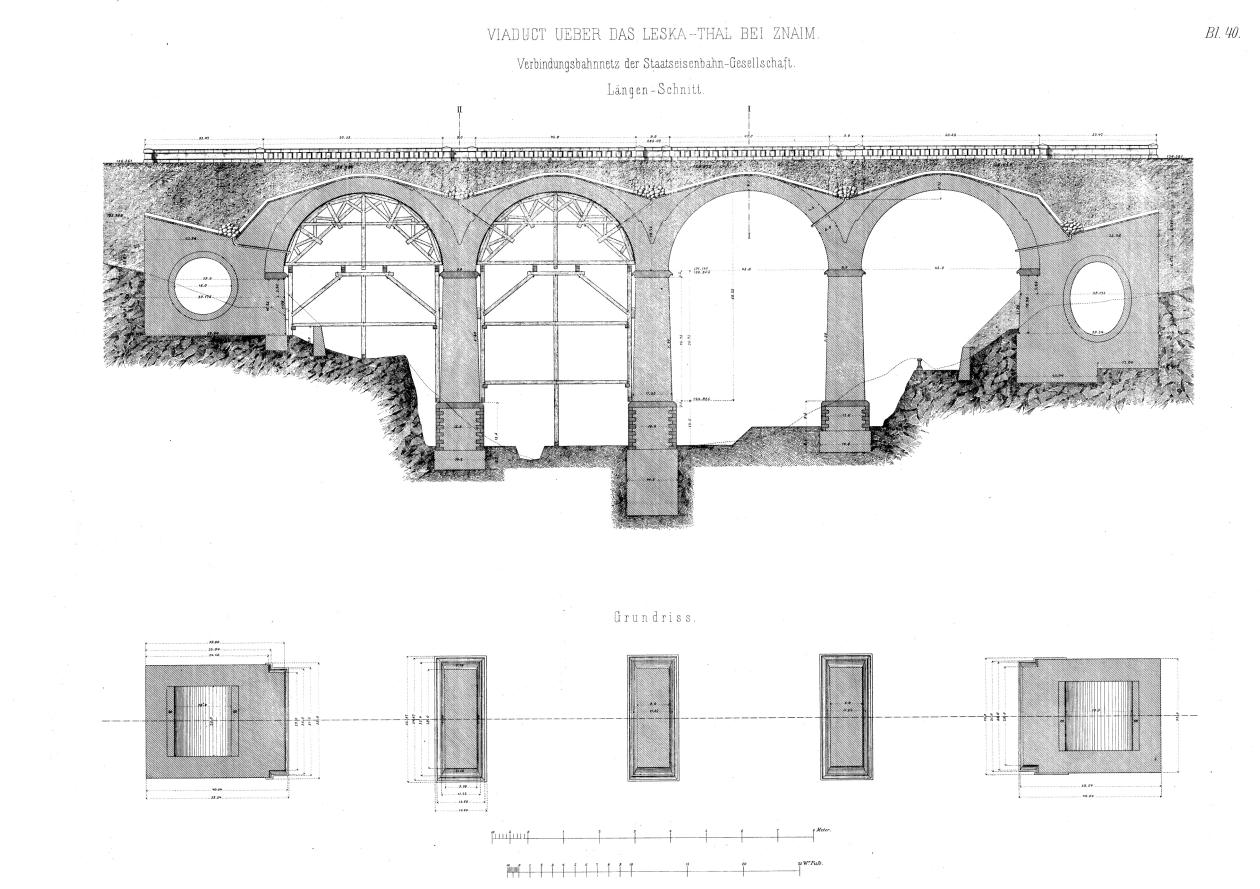 Edit: Most je ve skutečnosti betonový a kámen byl použit jako obklad. Projekt se během stavby měnil s měnícími se politickými a hospodářskými poměry podobně jako u mostů na nové trati Tišnov - Žďár n. S., ale řekl bych, že přiložený plánek je použitelný i jako příklad kamenného mostu.