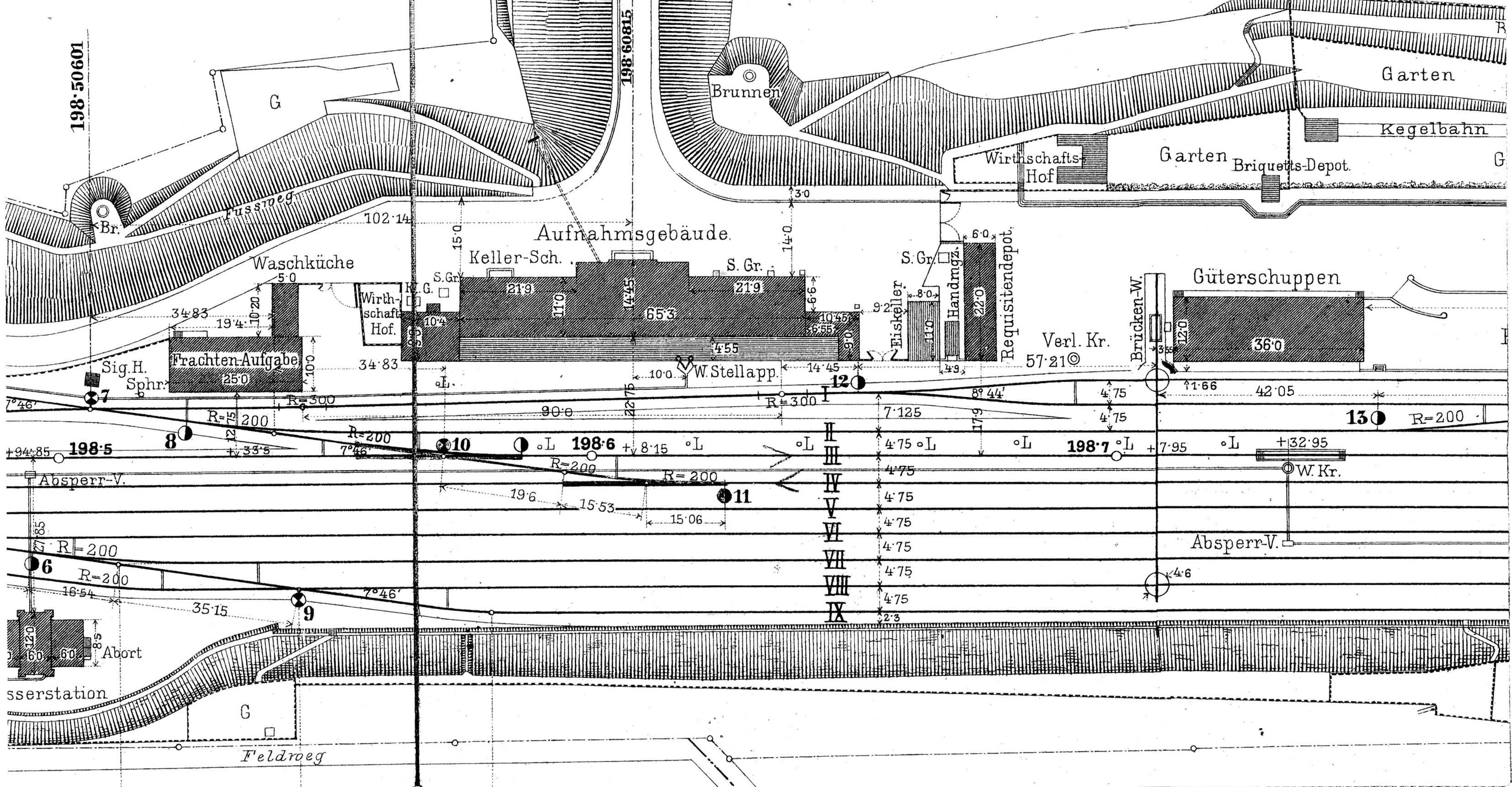 Podíváme se na architektonický, stavební a historický vývoj sedmi hlavních objektů městského nádraží, které se dochovaly do dnešních dnů (2024). V prostoru městského nádraží se jedná o tyto budovy a stavební objekty. Pro orientaci v katastrálním prostoru je uvedeno číslo budovní jak v původním systému jihlavských předměstí, tak jednotné číslo popisné novodobého číslovacího systému.