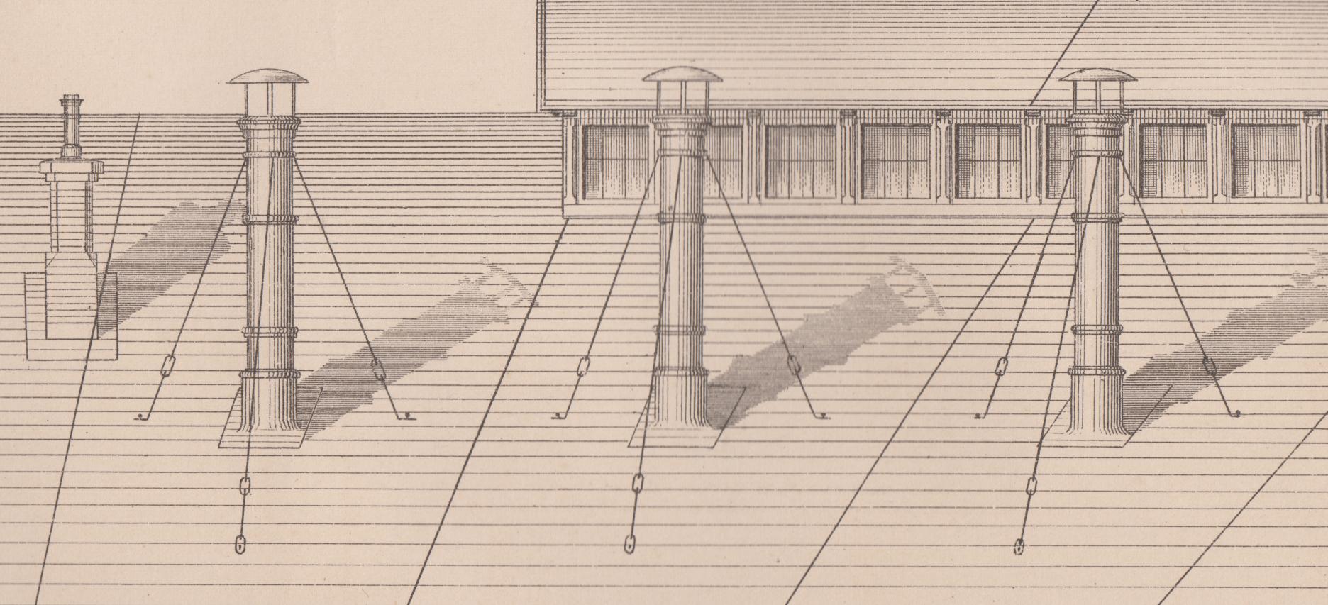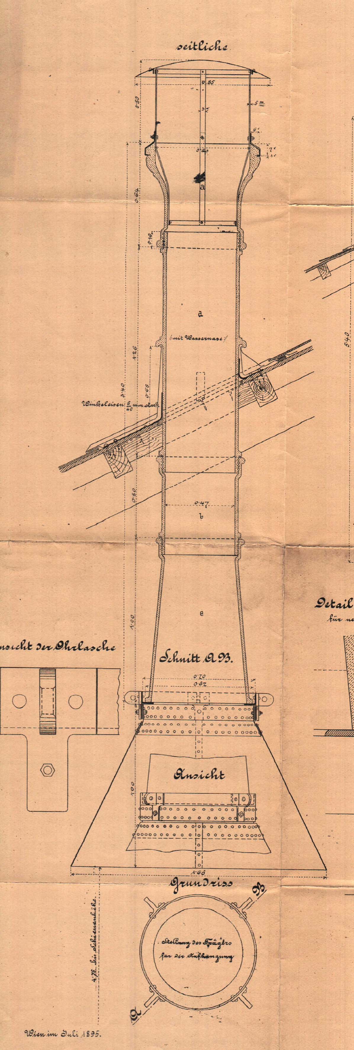 Dostal jsem výřez výkresu budovy s průmětem dýmníku a náčrt komínu