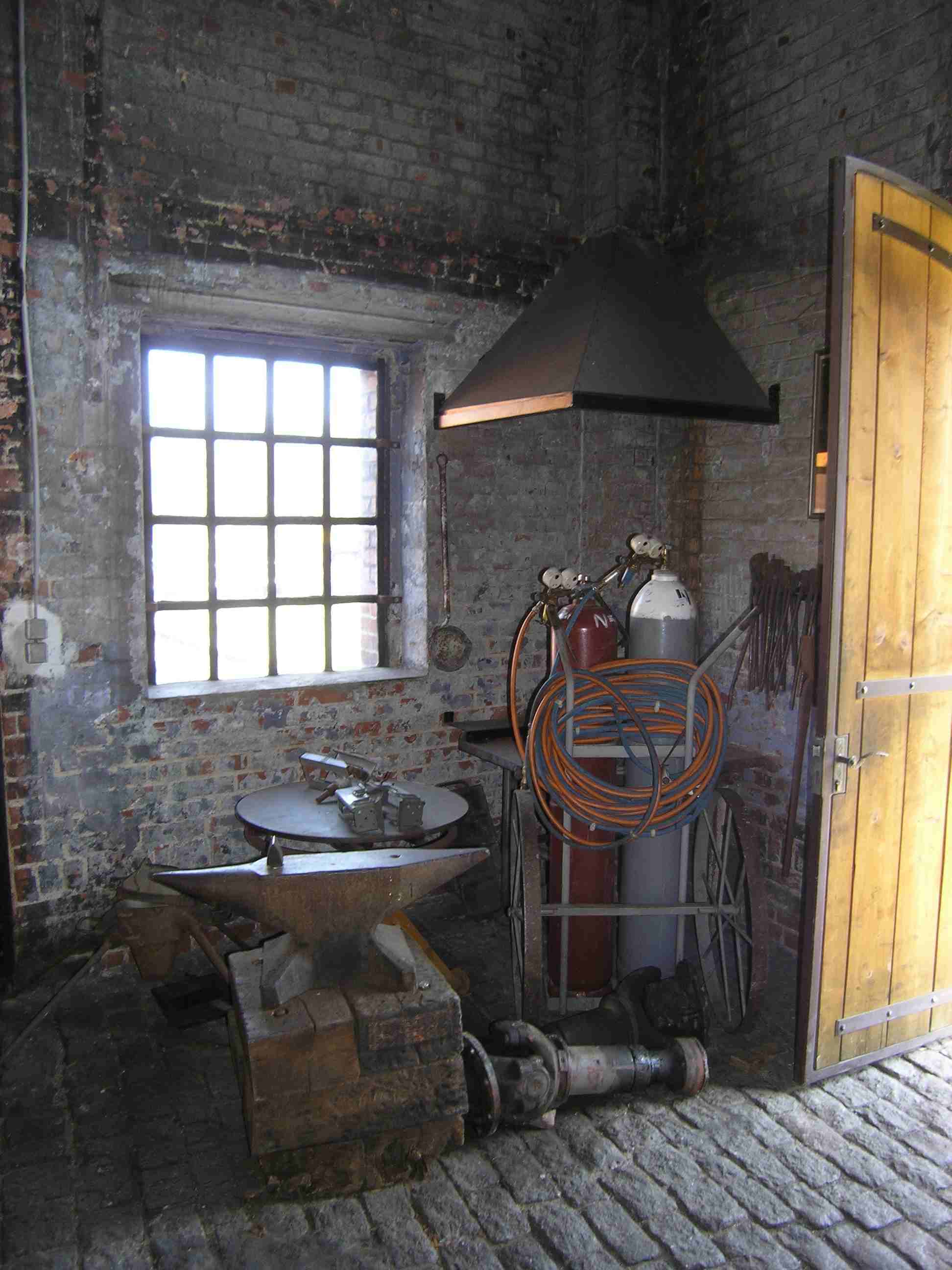 Takže vlevo u stěny vodárenského přístavku je Schmiede, tj. kovářská výheň, pod prostředním oknem Werkbank = pracovní stůl (můj děda vyučený ještě za Rakouska by mu neřekl jinak než ponk :) ), ve druhém rohu vedle vodárny jsou Sanddürrofen, tj. kamna na sušení písku a vedle nich Sandkasten = bedna na písek. Toť vše. Navíc v podobných případech v prostoru pod vodojemem, kde jsou naznačeny Kaserne, tedy nocležny, mohla být např. pidikancelář strojmistra, pokud tam sídlil, nějaký skládek (třeba i s těmi konvemi s oleji) a/nebo dílnička, pak by ta výheň byla asi v ní.