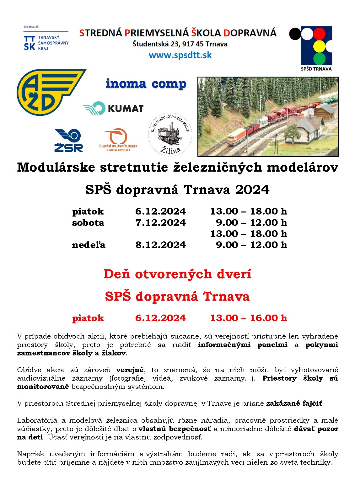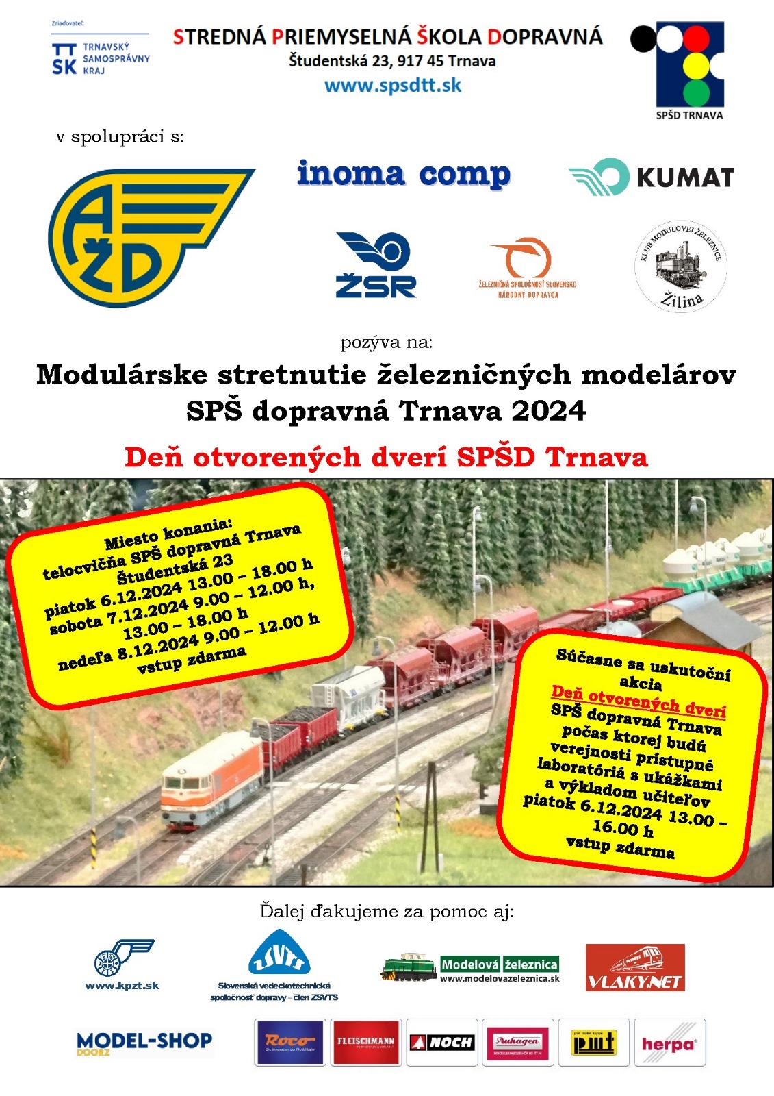 Na tohoročného Mikuláša a nasledujúci víkend (6.12.-8.12.2024) sa uskutoční Deň otvorených dverí SPŠD (iba v piatok) a Modulárske stretnutie železničných modelárov v SPŠ Dopravnej Trnave.