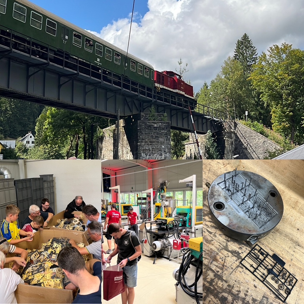 Auto jsme dle instrukcí zanechali v blízkém městečku Marienberg, odkud každou hodinu kyvadlově vyrážel zvláštní historický vlak do druhého města Pockau. Tam až jsme nejeli, jelikož jsme vystupovali hned u továrny Auhagen, která pro tuto slavnost vybudovala prozatimní zastávku. Po krátkém pěším přesunu do sídla, jsme byli uvitání a byla nám předána mapka celého areálu s doporučenou trasou. Při jejím dodržení každý návštěvník v úvodu obdržel papírovou krabičku, do které si postupně na několika staveništích vkládal dílky unikátní stavebnice. Jako návštěvníci jsme tak měli jedinečnou možnost si projít opravdu kompletně celou výrobou a vidět naprosto všechno co se výroby stavebnic týká. Jelikož mám velké srovnání s obdobnou firmou zabývající se výrobou z plastů a jejími dny otvřených dveří, tak Auhagen mne opravdu mile překvapil. Ukázal naprosto vše, nabídl spousty věcí k odběru a též všechny stroje byly funkční, takže i moje děti konečně viděli jak takové plastové výlisky vznikají. K vidění tedy byl samotný CAD návrh, tiskárna pro tisk návodů, obalů vč. oddělení laserovým řezáním kartonů, dále pak samotné sklady s tím nejcennějším, tedy samotné lisovací formy. V provozu pak běželo několik samotných vstřikovacích lisů i tiskárna s řezačkou. Na závěr prohlídky pak byla připravena ještě ukázka tamponového tisku na nově připravovaném modelu pro TT - autobus Ikarus.