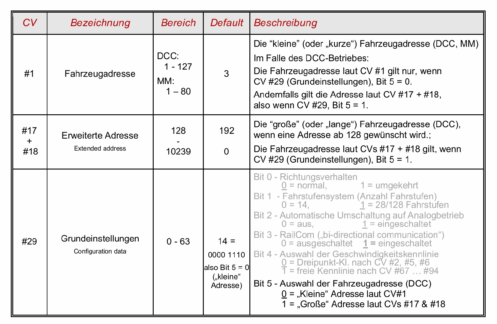 Výstrižok zo ZIMO manuálu. Toto sú povinné CV podľa normy pre všetky dekodéry.