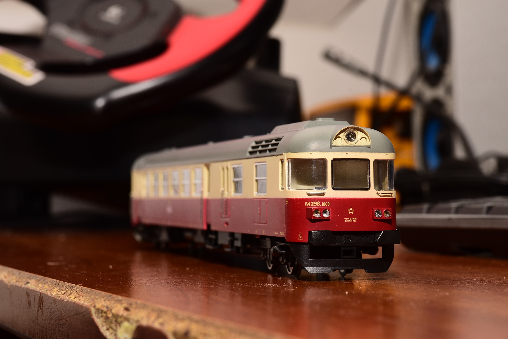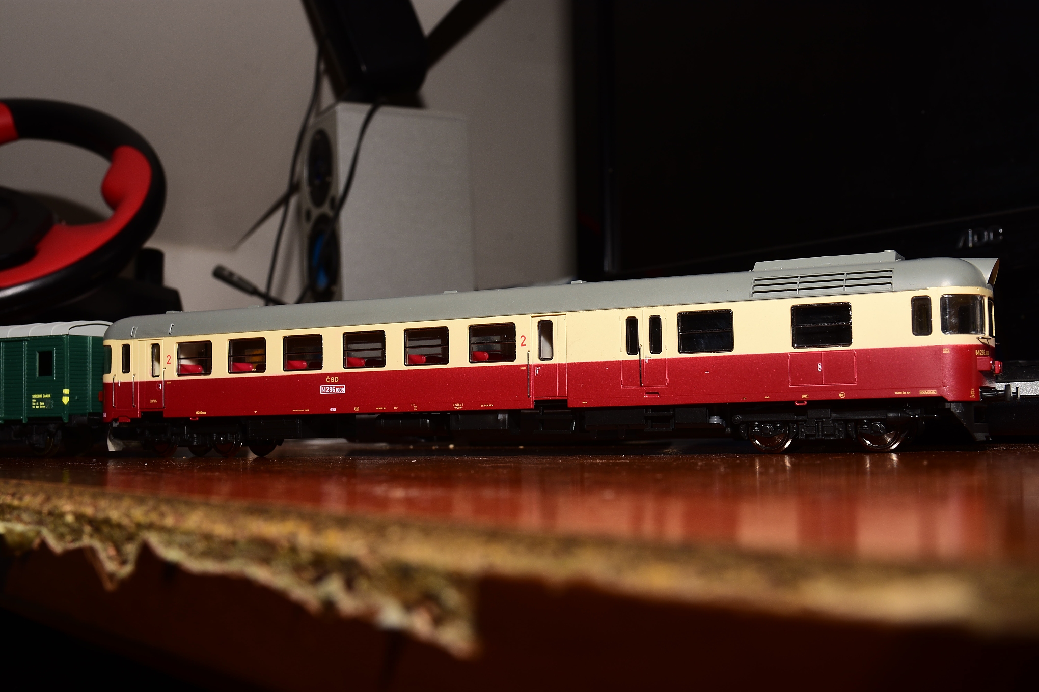 Tak dnes jsem měl v ruce vyreklamovaný kus M 296.1. Povrchová úprava je o něco lepší, ale stejně jsou na něm drobné stříkance na střeše červenou barvou a neostré přechody střechy a červeného pruhu pod okny.