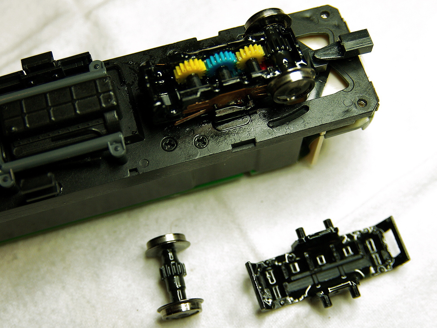 Při ježdění (zatím celkem cca několik desítek minut) jsem zaznamenal zhoršené rozjezdy, cukání,výpadky světel, někdy se motorák nerozjel vůbec ... Problém byl evidentně ve špatném kontaktu s kolejí. Po zběžné prohlídce jsem rychle zjistil příčinu.Zaolejovaná dvojkolí hnaného podvozku. Olej byl úplně všude :?. Rozstříkaný na rámu v okolí podvozku,na sběrných plíšcích... Po rozdělání to byla úplná potopa.Chvíli to vypadalo, že je uvnitř nějaký skrytý rezervoár toho oleje. 8) Čistil jsem a čistil, nakonec jsem převody a ložiska náprav namazal vazelínou, tak snad už to bude O.K. V tomto případě pořekadlo "Kdo maže, ten jede" tak docela neplatí. Bylo by fajn, kdyby výrobce v tomto ohledu trochu ubral a vůbec nejlepší by bylo používat vazelínu a ne tento olej. Na druhé straně musím říct, že mě potěšila na pohled slušná kvalita převodů, jejich rozumné vůle a použitý materiál - podle mě zlepšení proti převodům v šestikoláku, který jsem kupoval a rozebíral před delší dobou.