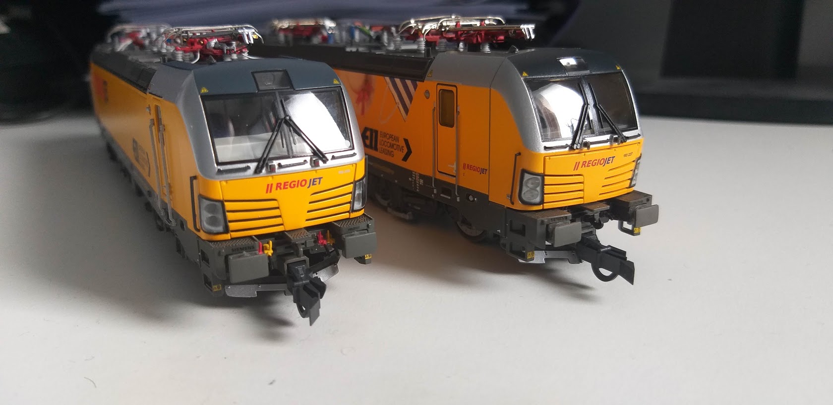 Nicméně, mě překvapilo na fotografiích výše, že každý model je jinak dlouhý. Mám tu docela dost cargo Vectronů od LS i Roco, dva koupené v posledních měsících (obojí SBB Cargo) jsem teď oměřil a sedí délkově velice přesně. Jeden z výrobců (Roco?) zřejmě upravil formu. Co se madel týče - Roco s tím má problém, kupř. na jeřábu EDK750 s ohledem na jeho detailnost působí čelní zábradlí skutečně jako pěst na oko. Nové Roco Vectrony ale nemají madla osazená a v příslušenství jsou madla cca 0,4 mm průměru, která poměrně přesně odpovídají realitě. Takže ani to bych neviděl tak tragicky a Roco RegioJet Vectron bude zřejmě vyrobený v podobném duchu. Velikou výhodou Roco modelů je pro modeláře fakt, že Roco nelepí. Vše ostatní krásně sedí - nárazníky jsou souosé u obou modelů postavených proti sobě. Oba modely jezdí krásně tiše, při všech rychlostech. Subjektivně bych řekl, že LS je ještě o maličko tišší.