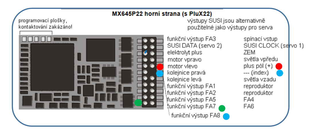 V lokomotíve je dekodér Zimo MX645P22 ... výrobca "SD-modell" mi odpísal, aby som (+) oboch spriahadiel pripojil na V+ a (-) na FA7 a FA8 (index) ...