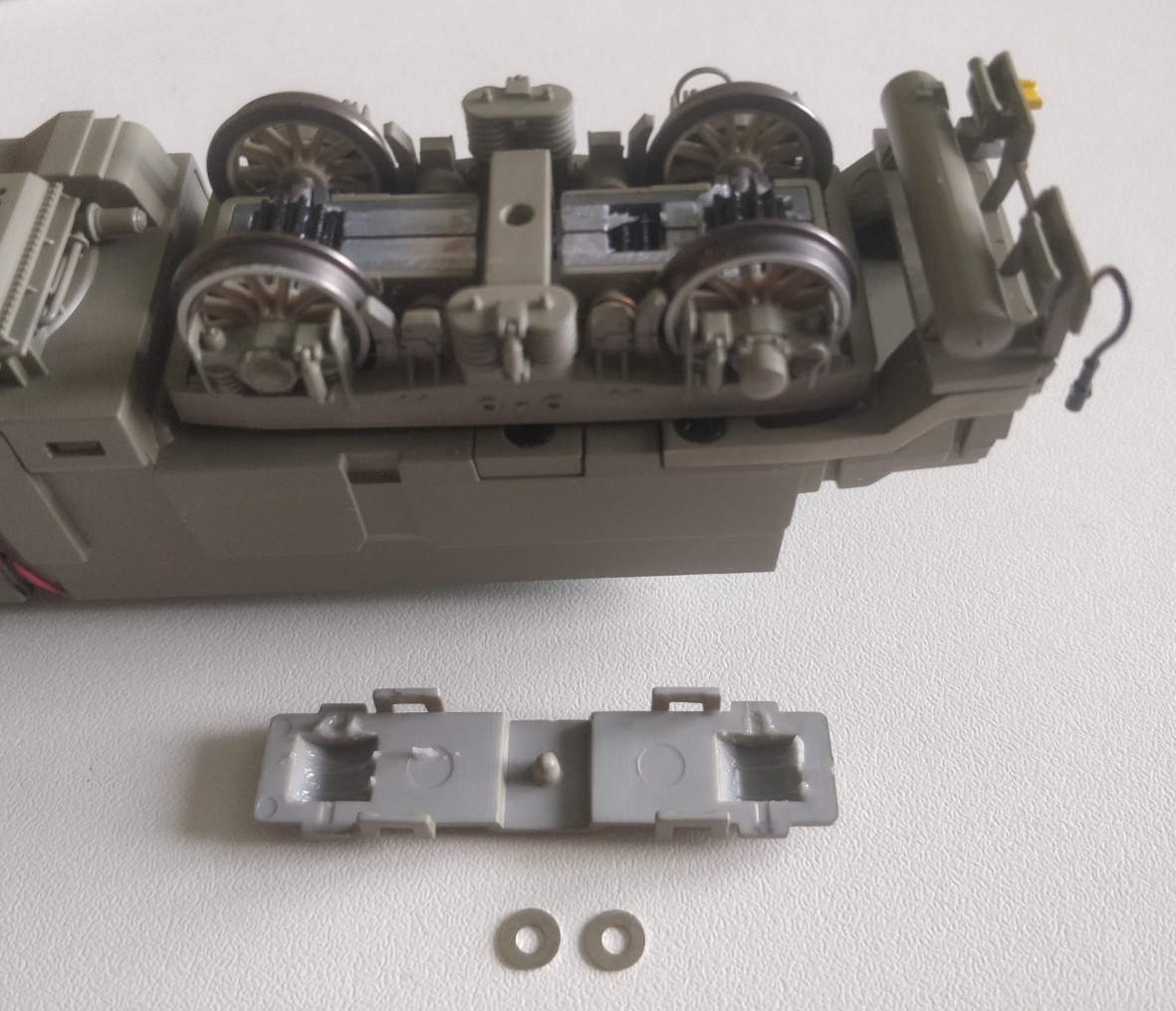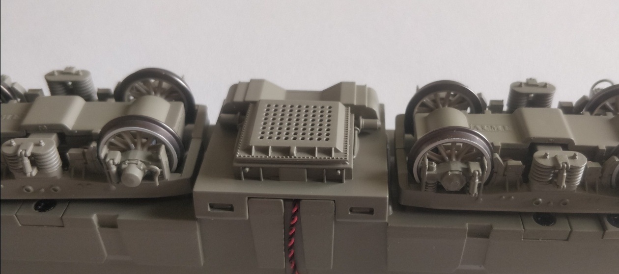 Jenomže účel té chybějící podložky je opravdu vytvoření tříbodového uložení skříně na pojezdu (už jsem to tu psal), který bez odlehčování kol s rizikem vykolejení projede i značnými nerovnostmi nebo vzestupnicí.