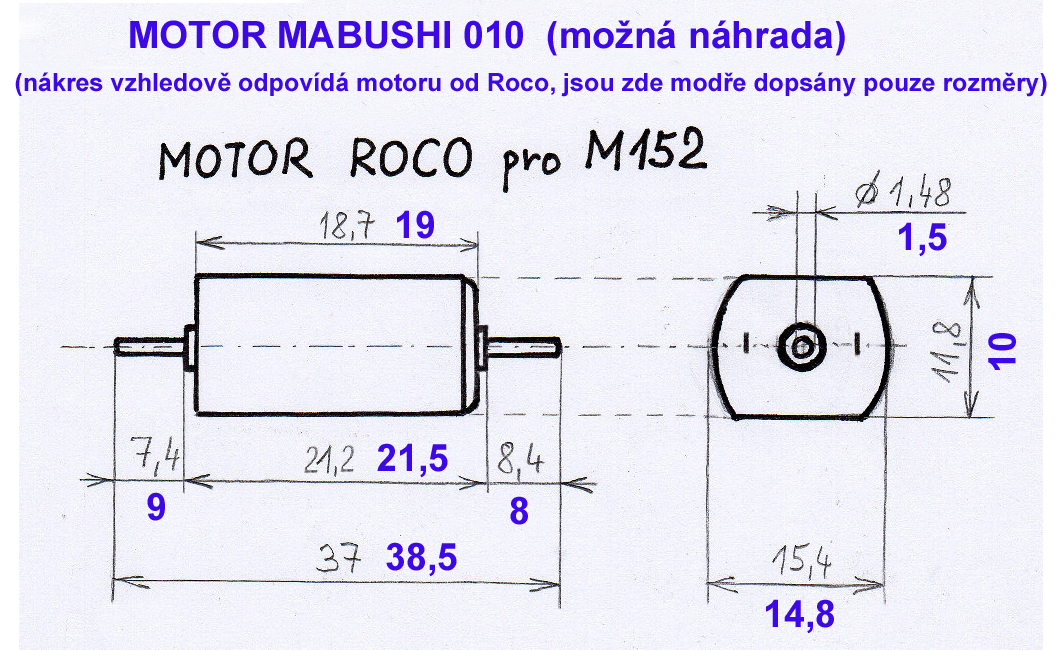 Pro srovnání rozměrů přikládám náčrtek, kde jsou k černě napsaným rozměrům původního motoru doplněny modře rozměry motoru Mabushi.