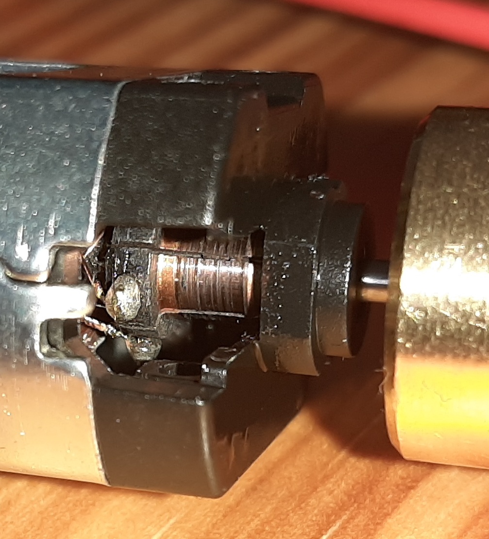 Jen na vysvětlenou : červená bužírka na levé hřídeli je tam nasunutá proto, aby bylo vidět část komutátoru, který je jinak díky působení magnetů na rotor více zasunutý pod krytem 8)