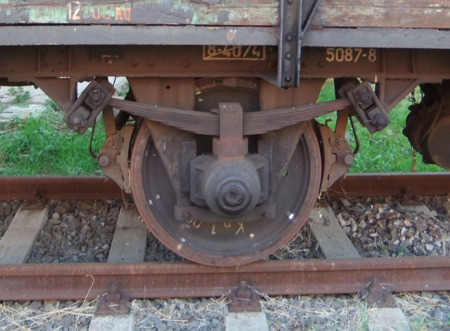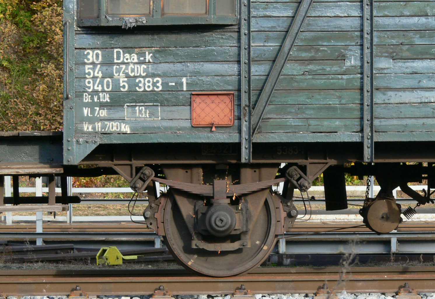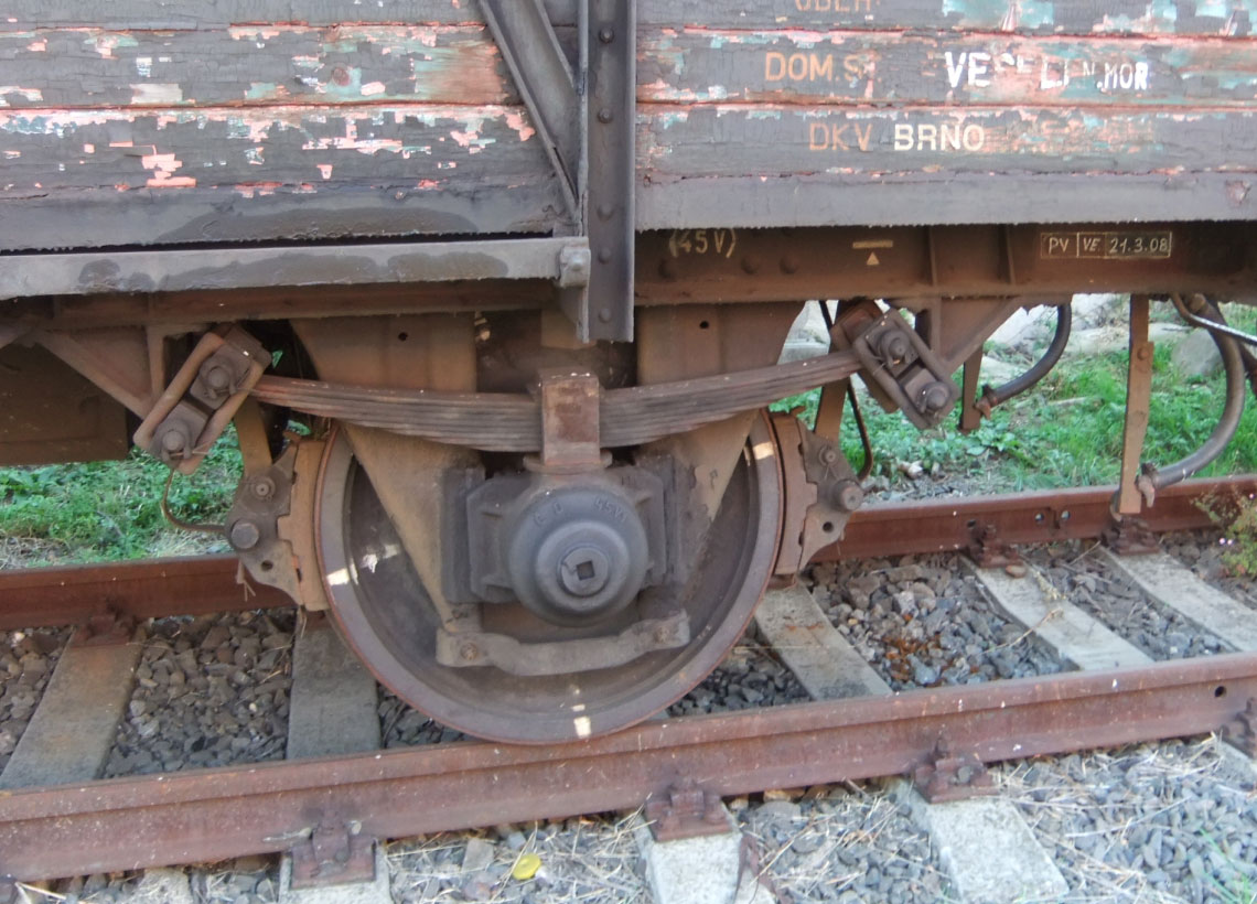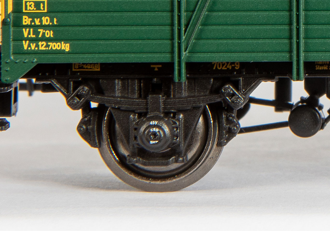 Náprava je složená ze dvou polonáprav s poloosou 2 mm, spojovací trubička má 3,95 mm, sestaveno na klasických 24,7 mm přes hroty. Toto řešení používají i jiní výrobci na vozech, které jsou připraveny pro sbírání z ložisek. V tomto případě jsou lisovaná z měděných plíšků vlepených zhora. Náprava je proti jiným řešením trochu brutalistická, BRAWA má profilovaná kola, některá RP25, poloosy 1,5 mm a vnější průměr spojovací trubičky 2,45 mm. Přeci jenom to vypadá lépe.