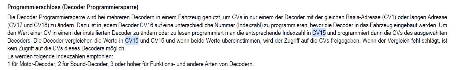 Mozes skusit pozriet manual na iny dekoder, naprilkad rozsireny manual na Vectrona, zial vsetko v Nemcine a nemas zaruku ze CV nastavenie budu identicke, ale tak snad dekoder lock a reset budu rovnake. Skor sa lisia v Susi Bankach (zvukove a svetelne nastavenia).