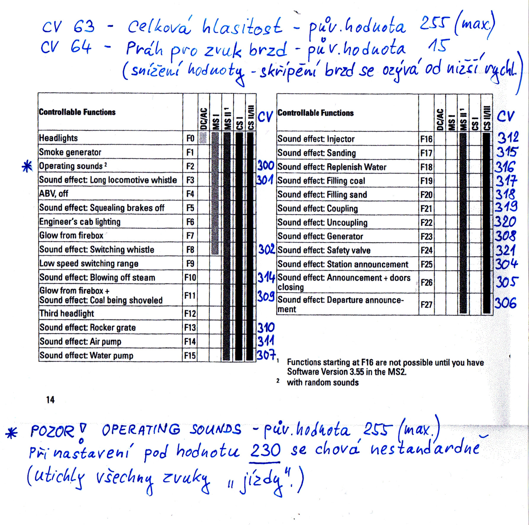 Nemám stažený SW ani programátor od Trixu, zatím jsem nepřišel na to, jak změnit přiřazení funkcí k jednotlivým tlačítkům pomocí CV. To bude asi větší oříšek. Chtěl bych přiřadit zvuk el. generátoru ke světlům na F0 a ještě pár změn z tlačítek nad F20 ... Hlášení jsem ztlumil úplně, protože se to nedá poslouchat .....