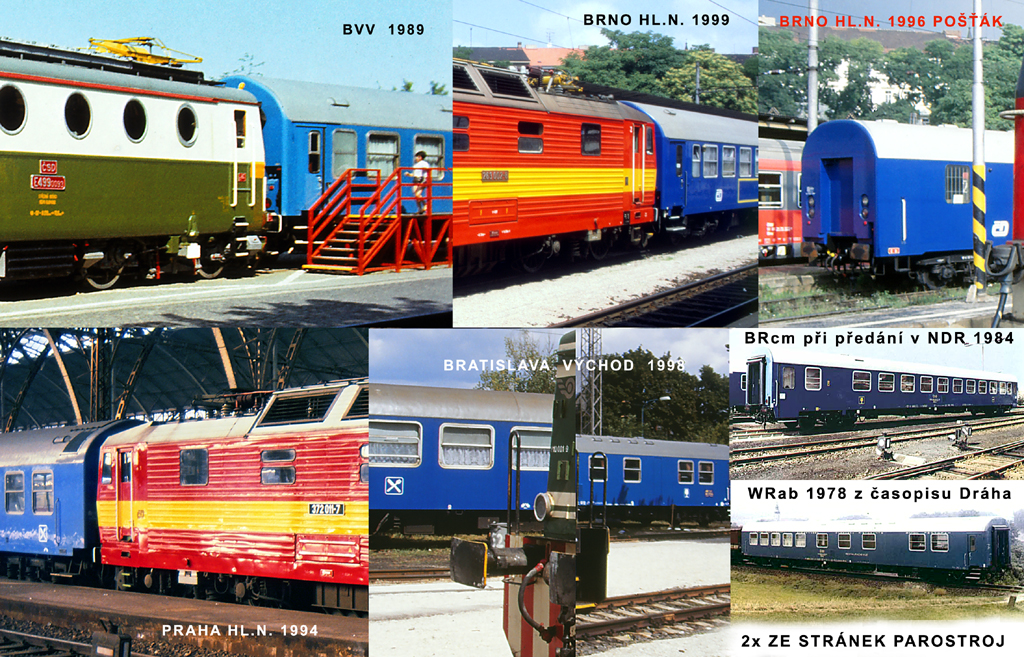 Na dalších výřezech z Bratislavy 1998 a Brna Hl.n. 1999 (i tady jen doufám, že se jedná o jídelní vůz :) ) jsou podle mě barevně shodné nátěry vozů ČD i ŽSR. Jen pro zajímavost jsem přidal ještě fotku vozu české pošty z r. 1996, jehož odstín bude pravděpodobně stejný, jako u těch jídelňáků). Modrá na této trojici vozů ale vypadá o něco tmavší, než z období vozů s označením WRRm.