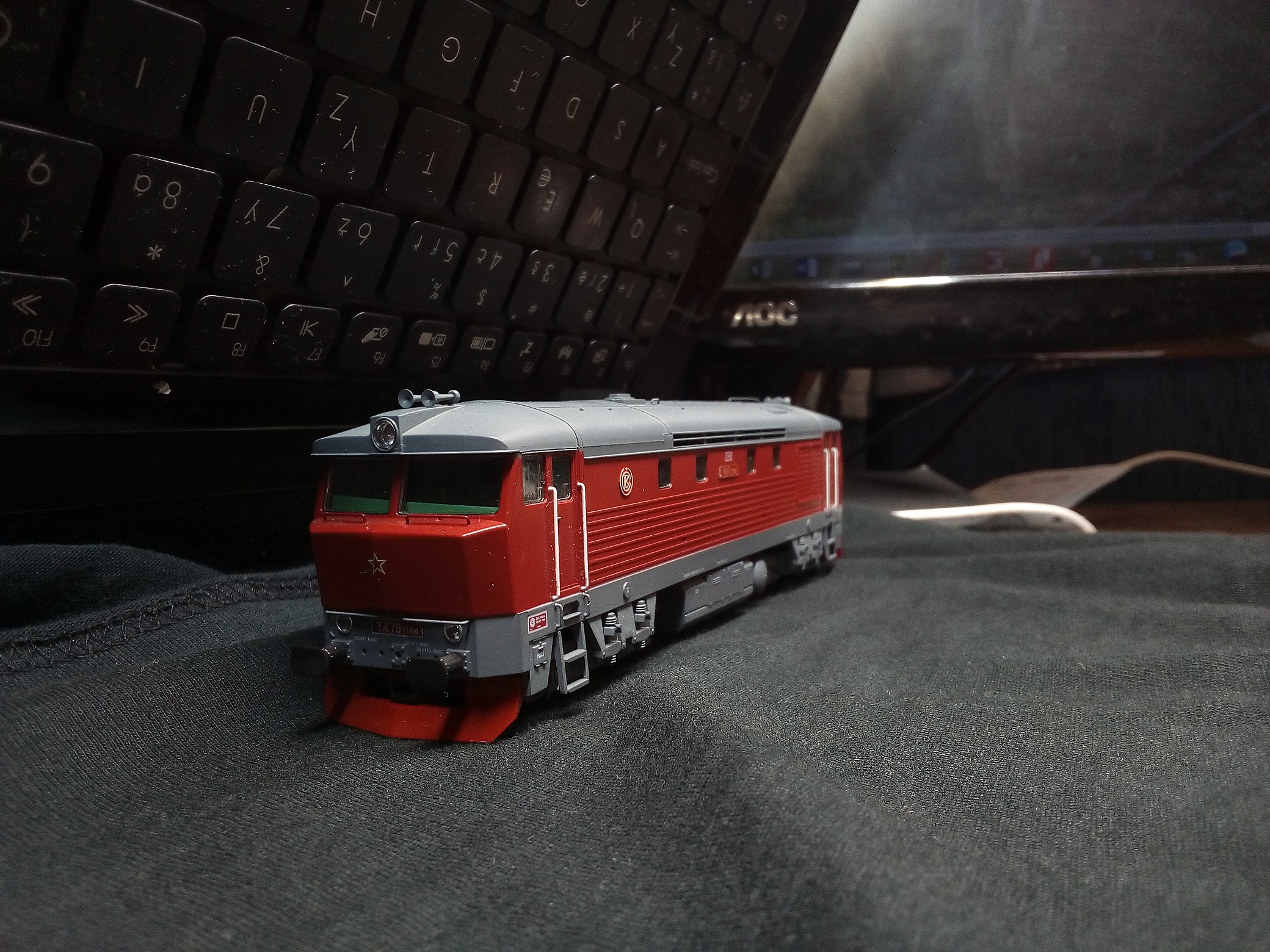 TomBart: Mašinka hezká což o to, mohla by to být i kralupská T478.2071 (viz foto níže), ale co se týká patiny zejména střechy dovolil bych si menší "dodatek" jestli nevadí. Tu střechu musíš chápat jako dá se říci takovou paletu různých barev, která není nikdy úplně stejná, ale hlavně není jednolitá, což v tomto případě je. Trochu je potřeba si představit, jak se ta střecha v reálu vůbec takto ušpiní. Hodně to závisí mj. na tom, na jakých výkonech ten a ten stroj zrovna jezdí a v neposlední řadě i na strojvedoucích, kteří na ní jezdí a jak důsledně používají při brzdění vlaku lokomotivního odbrzďovače OL-2. Stroje, které jezdily převážně na posunu se špinily rychle, neboť mnohokrát za směnu často následovaly náročné rozjezdy do výtahu, brzdění, rozjezd a zase brzdění. Tím vzniká opotřebovávání brzdových špalíků, ze kterých se pokaždé při brzdění uvolňuje právě ten mikroskopický prášek známá a všudepřítomná, rezavá, drážní špína. Ten prvně ulpívá na kolech, podvozcích a jejich okolí (tzn. vzduchojemy, závěsky, naftová nádrž), pak se dostává i vlivem chodu ventilátorů trakčních motorů proudem vzduchu na kraje střechy.