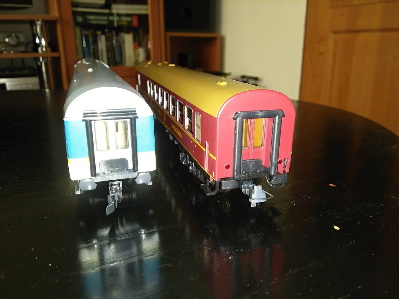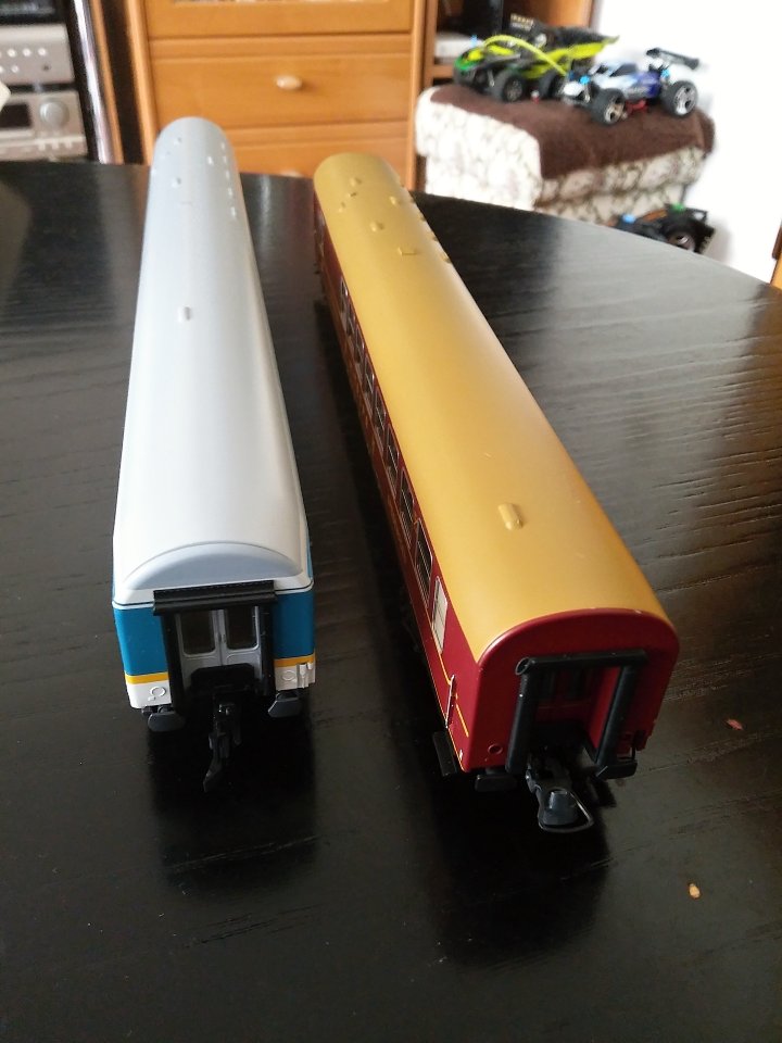 ...vlevo Tillig (BRmh Arriva, 74749), vpravo Roco (WRm Mitropa DB, 45716) U Tilliga jasně vyniká na čele nesprávný tvar střechy, navíc ještě umocněný špatně lícujícím dílem střechy, který té střeše dodává ještě "kulatější" dojem. Roco má tvar čel a střechy mnohem blíže realitě. A prý, že to nejde v měřítku 1:87 poznat... :)