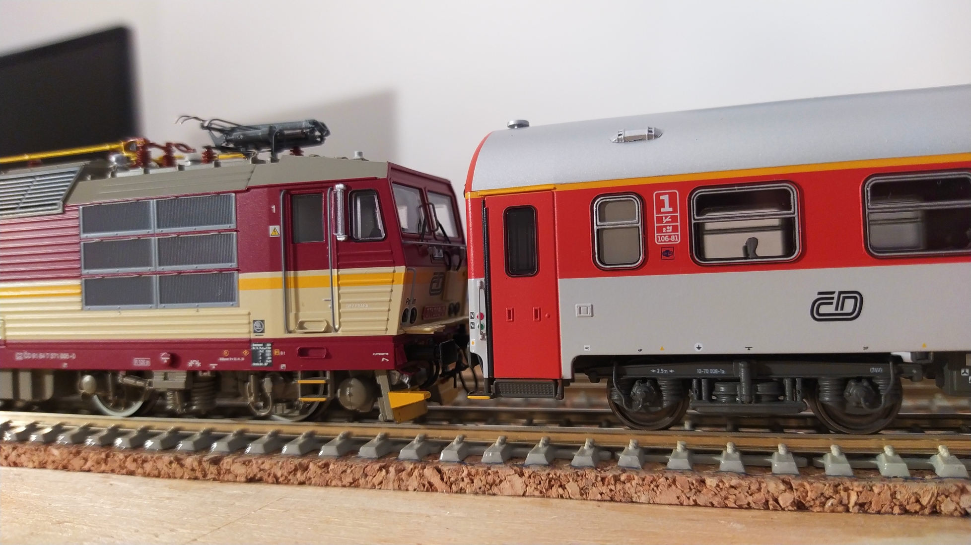 v rychlosti kontrola bastarda, Pepina, A.c.m.e. a vypadá krásně, podvozek jeden kyvný jak ostatní stroje s hranatou skříní čili je níž kastle, nepatrně. Pluhy jsou nad kolejí výš takže to není tak patrné jako u 362 a 163. lávku na jednom čele jsem přihnul a leptané tabulky jsou na oboustrance, jednu jsem rovnal. Dekoder nemám takže dovnitř dneska nelezu, topné spojky vypadají jako když jsou obě lepené po ulomení ale asi nejsou.Je tam hrb při vstupu do díry v podvozku, do tý díry kam se ten konec spojky zasouvá respektive odkud vede. Recenze jindy...