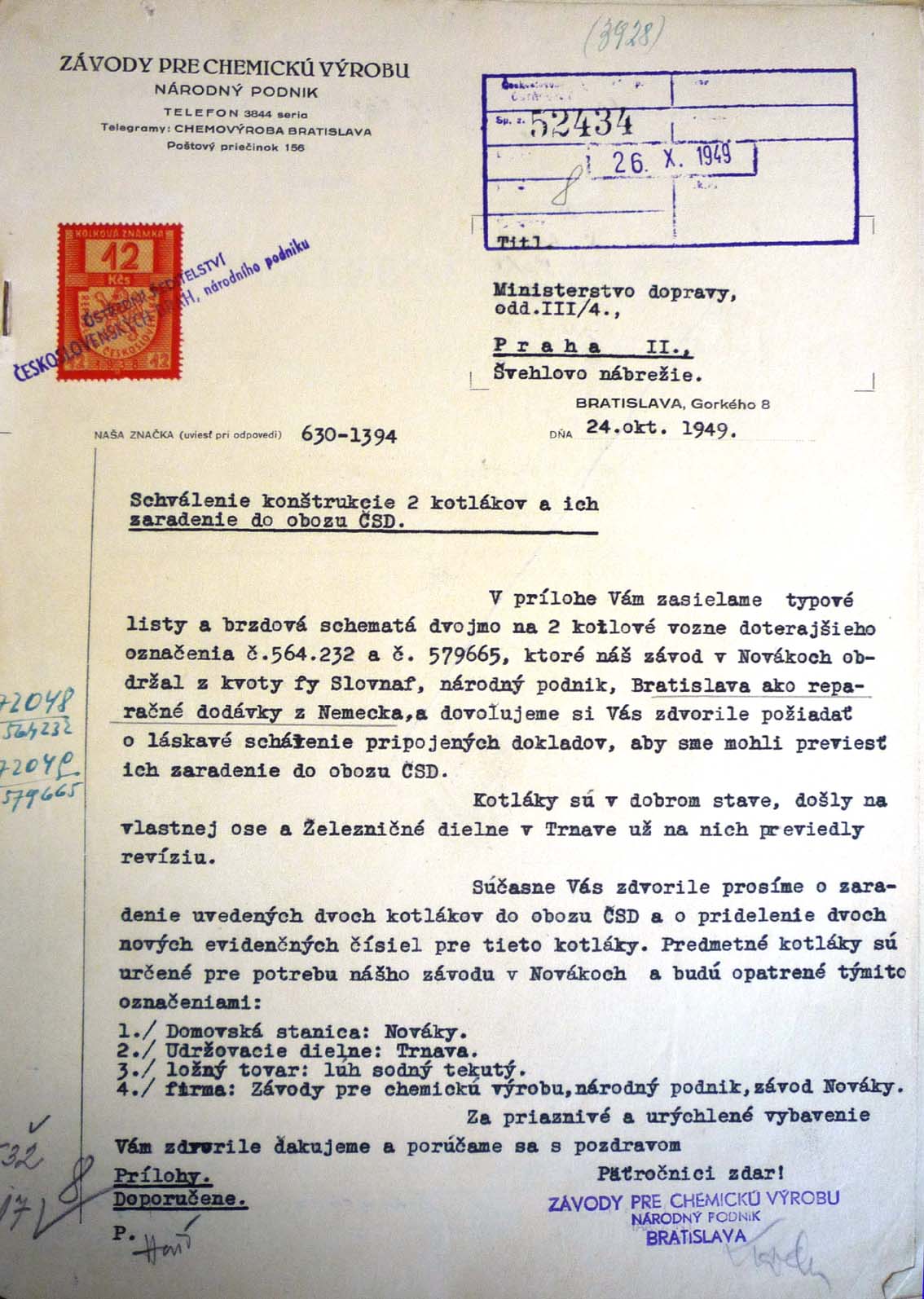 Pokud jde o kotlové vozy pro Chemičku v Novákách, tak firma održela dva tyto vozy v létě 1949 z reparace. Nově přidělená čísla pro ně jsou napsána na dokumentu vlevo, tedy 048 a 049 na konci.