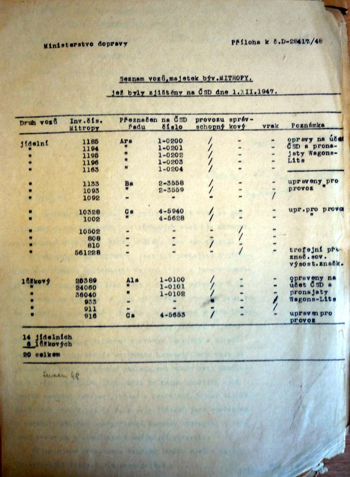 Je to cenný dokument, který objasňuje počátky provozu vlastních lůžkových a jídelních vozů ČSD. Přikládám vozovou kartu Ala 1-0102. Stále zůstávají otázky: