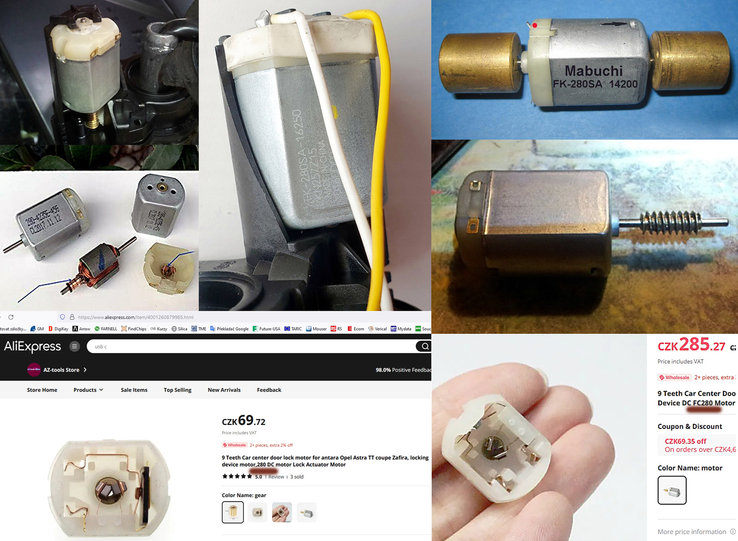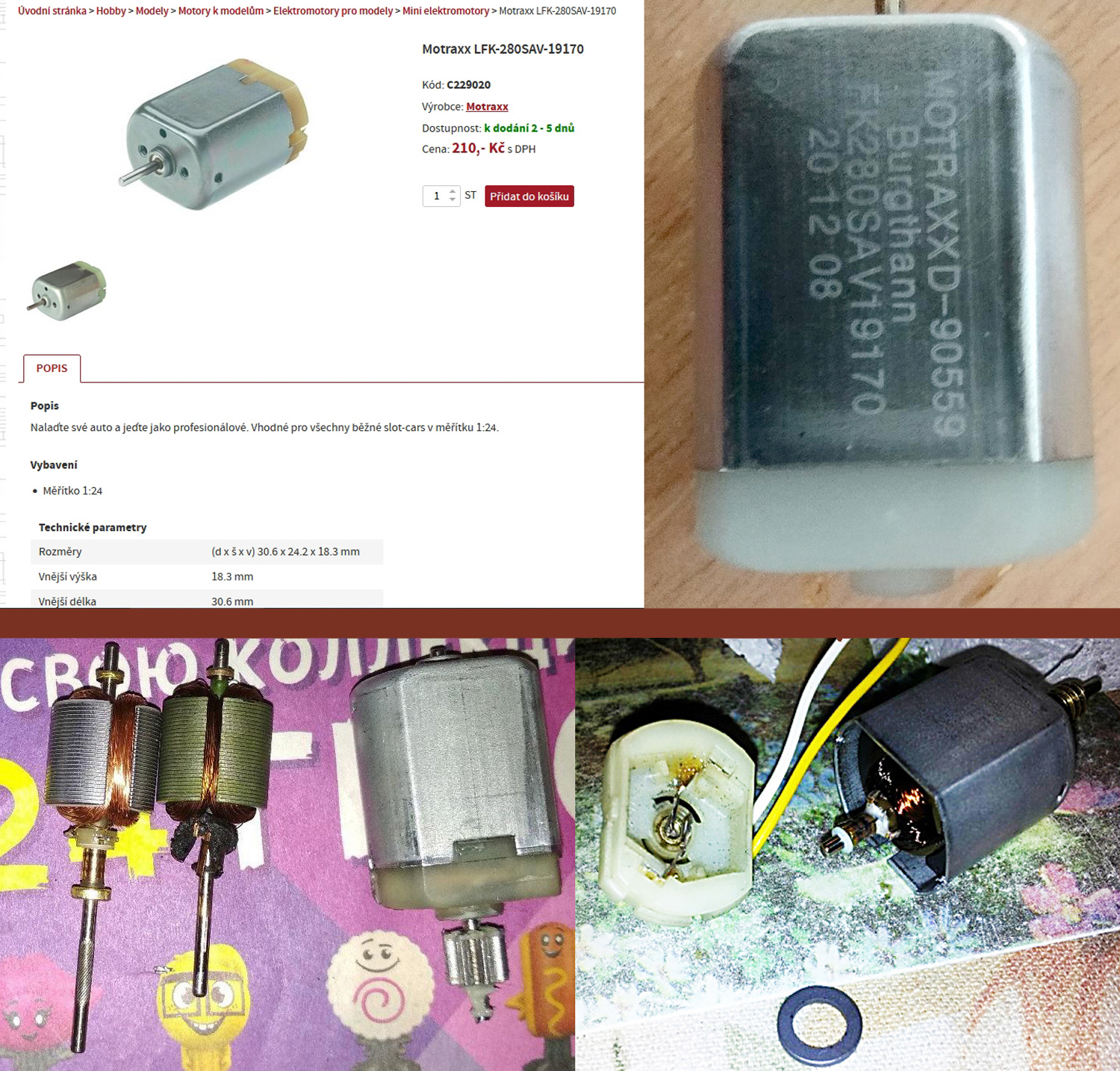 Hledal jsem motory podle označení, které poskytl Pawlik, a trochu mě překvapilo, že motory s podobným označením ( velmi podobným provedením, rozměry i konstrukcí ) zdaleka nevyrábí jen jeden výrobce. A ani ne dva výrobci. Spíš to vypadá tak, že výrobců takových motorů, jejichž společným "jmenovatelem" je označení 280, je celá řada. Od - řekněme - značkových výrobců jako je Mabuchi nebo Motraxx až po čínské NoName výrobce. Nabízí se ovšem vcelku jasné vysvětlení , že právě takovéto motorky typové řady 280 se zjevně používají v automobilovém průmyslu pro pohon elektrických zámků dveří, zámků nádrží, naklápění světlometů ..... K tomu přikládám pár snímků pro ilustraci :