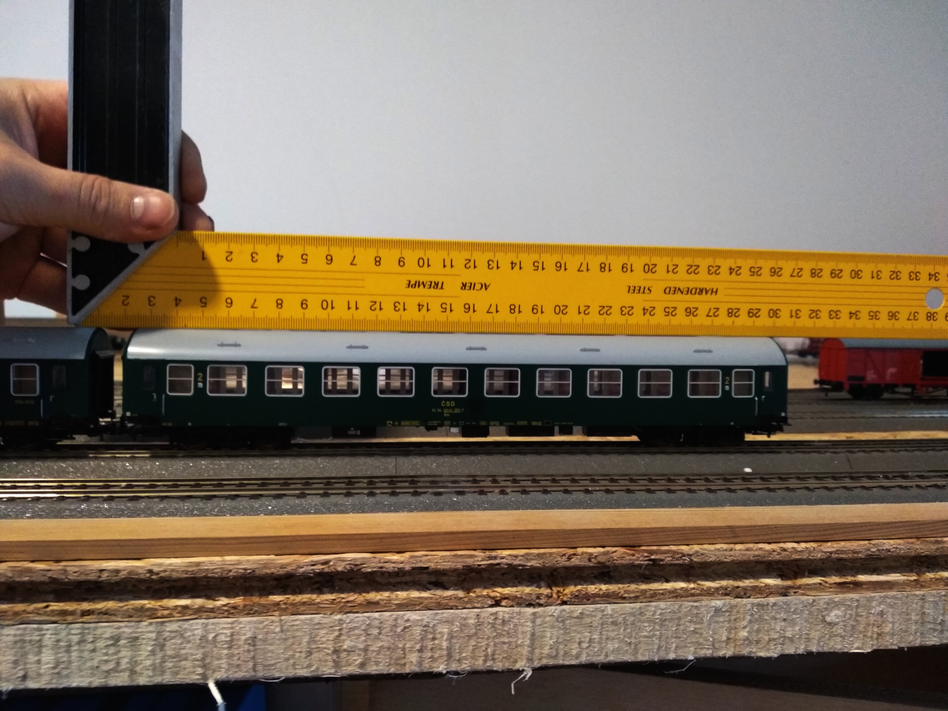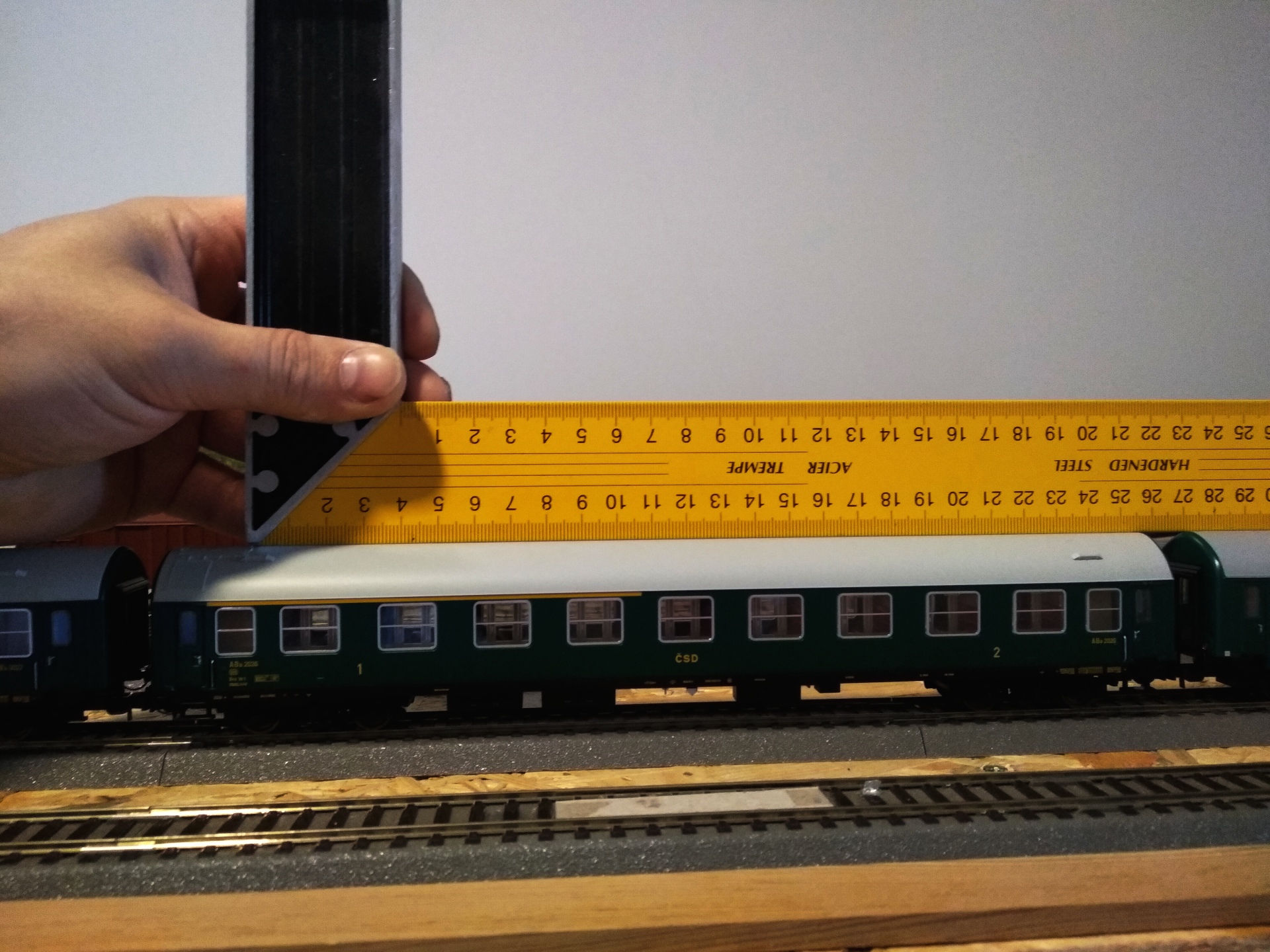 Tak první, ani ne milumetr mezera, druhý vůz rovněž, třetí rovný, limitka prohnutá cca 1 milimetr.Vozy jsou vloženy obráceně, první fotka je třetí vůz bez průhybu. Pokud je to tím jak píše kolega George V. tak to zjistím večer až je rozeberu.Dám vědět