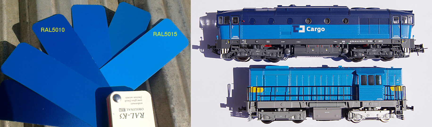 Dnes jsem měl na chvilku půjčený vzorník RAL, vyfotil jsme na slunci některé modré záložky (za velmi podobných podmínek, jako jsem fotil model T448.0910) a zde je výsledek :