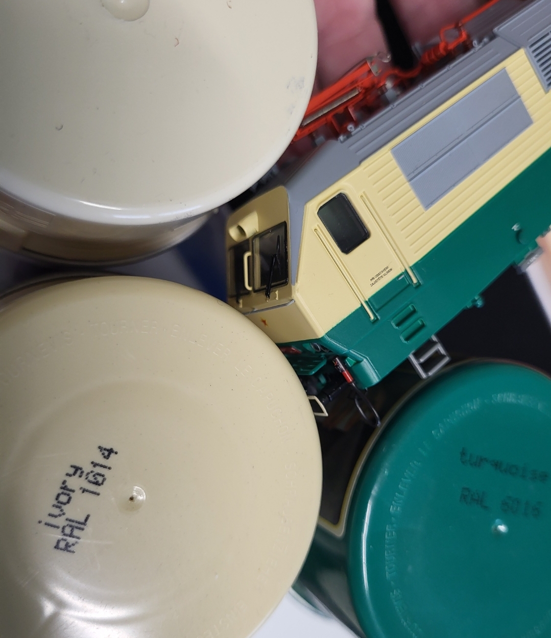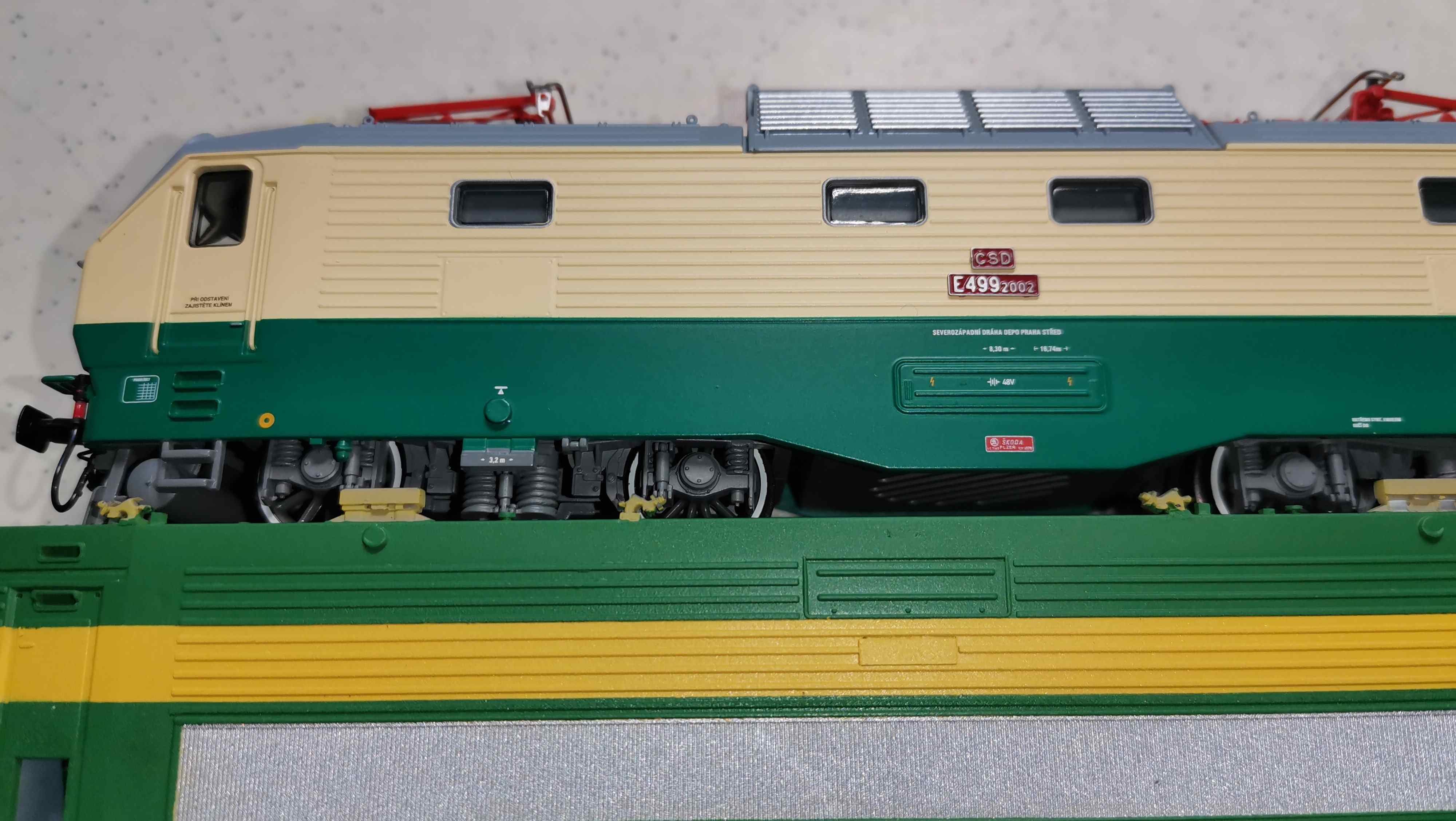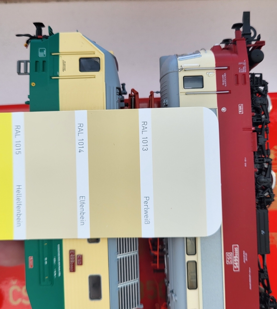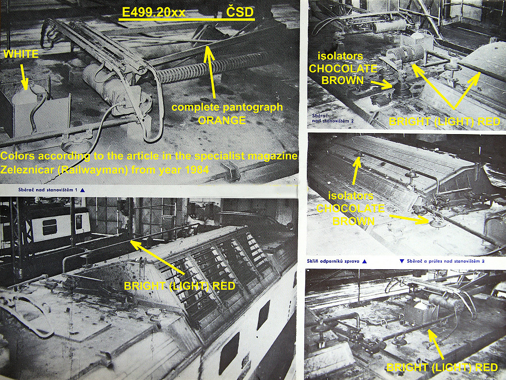 Podle popisu ve starém Železničáři byly pantografy z výroby oranžové ( koneckonců je to docela dobře patrné i z těch nepříliš kvalitních továrních snímků o pár příspěvků výše - červená je hvězda, kohouty hadic, řadová tabulka, ale pantografy jsou - světe div se - oranžové ...). Červené byly údajně jen "sběrnice". :-/ A je dost možné, že oranžová byla nakonec celá výzbroj na střeše.