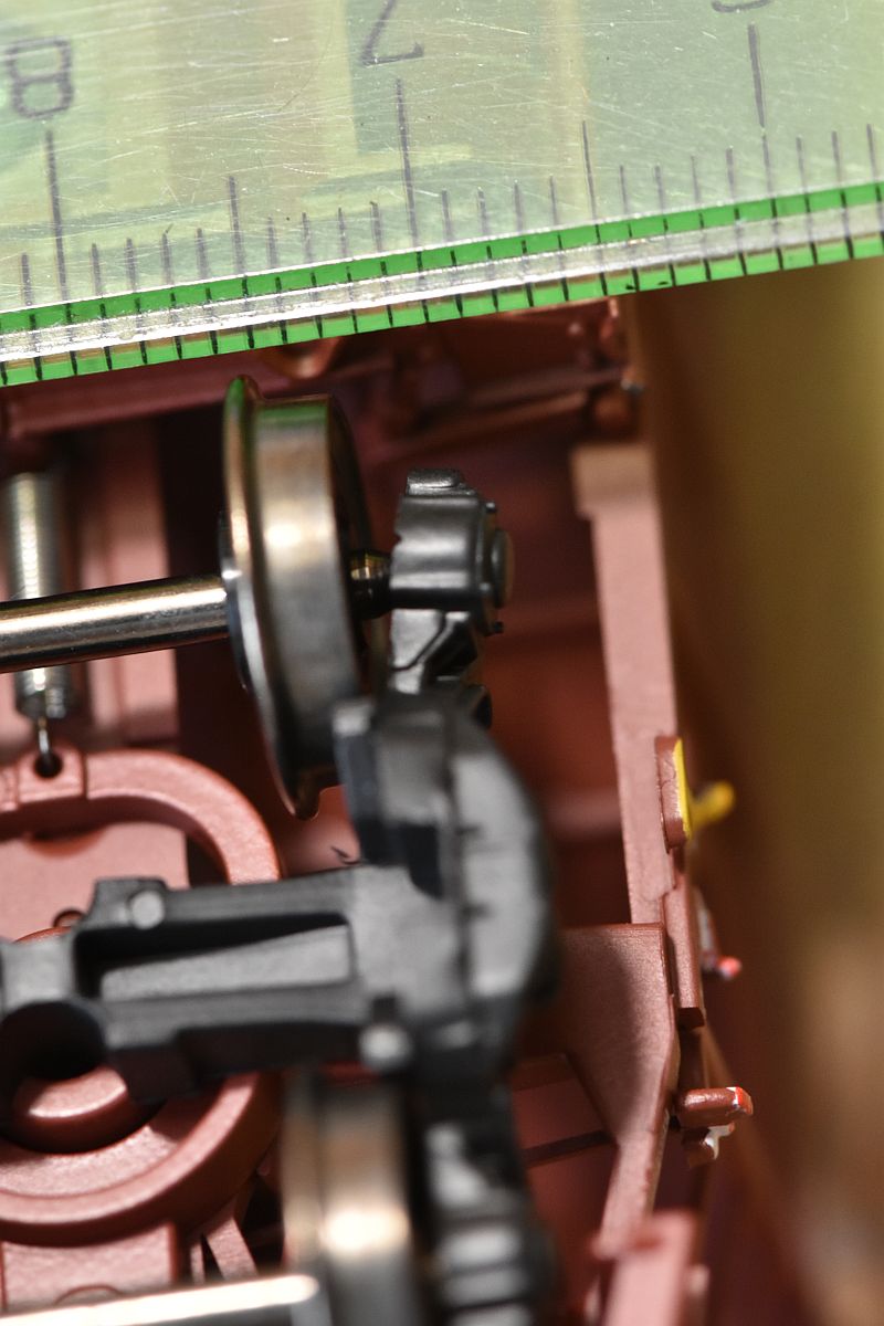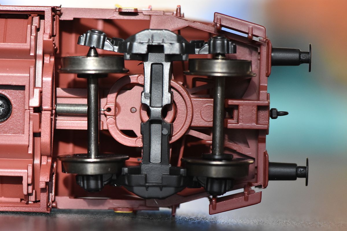 Tím otvorem je to suvně nasazené na vagon. Musí tam dostatečně držet. A z podvozku jsem odřízl výstupky, které asi měly držet tu kinematiku, ale spíš se o ni zasekávaly. Zamáčkl jsem podvozky a spokojenost.