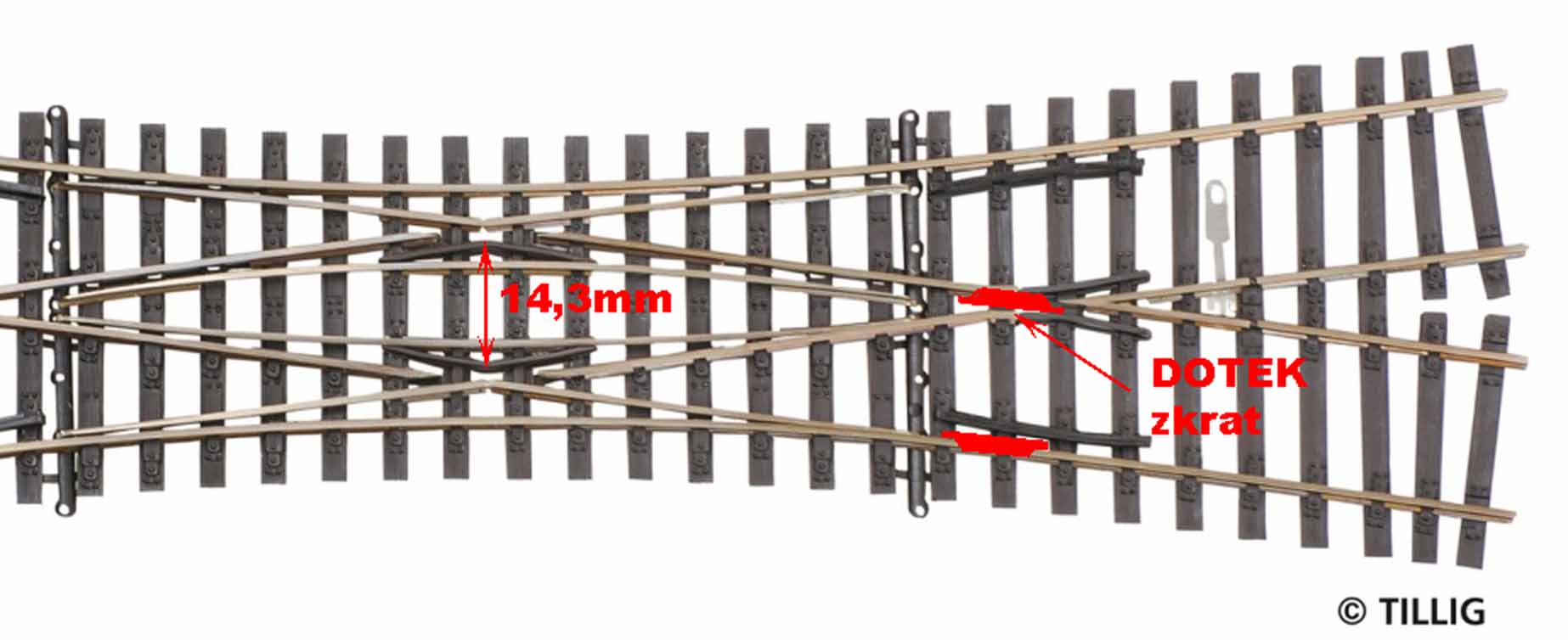 Kde mám problémy na angličanech. Jednak uprostřed, když je rozkolí menší než 14,2, tak to poskočí, a někdy v blízkosti srdcovky, se kolečko vnitřkem dotkne protější koleje s opačnou polaritou. Na jazykách problém nemám, protože jsou na stejné polaritě.