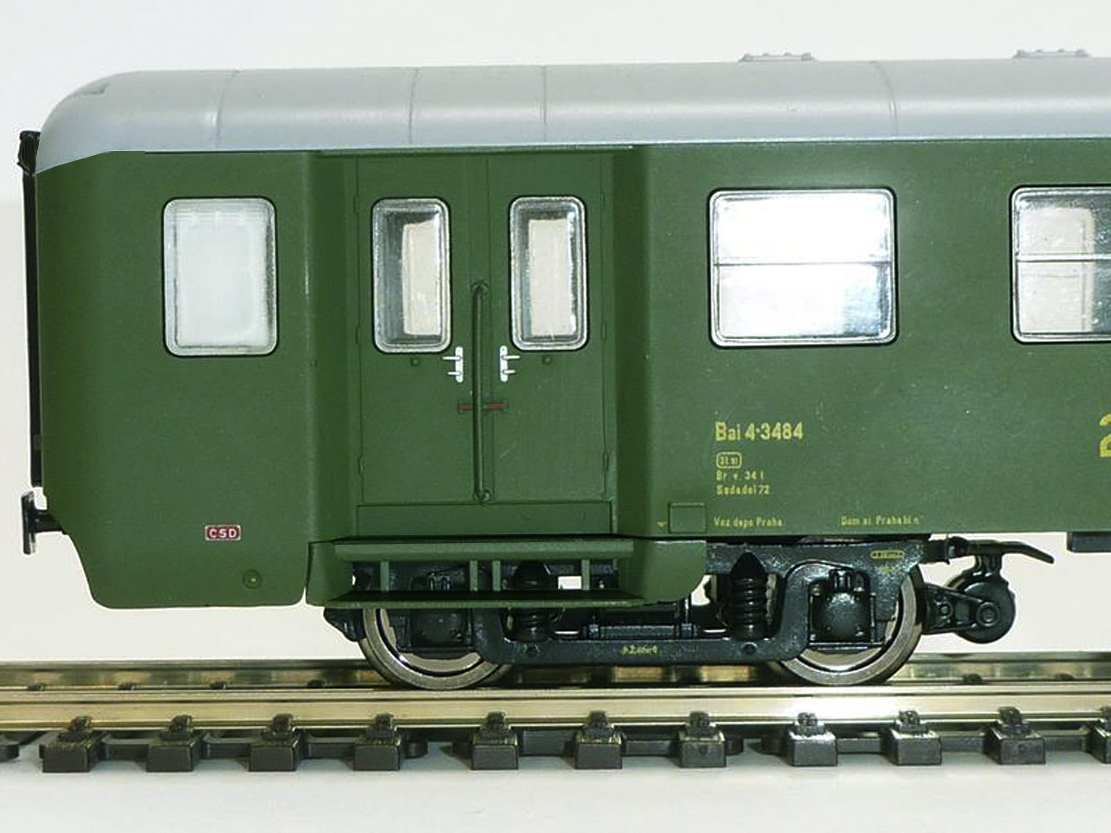 - střecha, čelo a bočnice jsou svařeny v jeden celek, tedy na modelu spolu musí lícovat - viz foto. Pokud je střecha samostatný díl, bude vidět jen spára mezi nimi. Jak bude proveden nástřik mezi zelenou a šedou barvou určuje až šablona pro ten který model. Může se tedy stát a určitě se stane, že šedá nepůjde u novějších variant popisu dolů ale bude vodorovná, případně s obloukem stočeným ke střeše. Okap končí cca 30 cm za oknem WC. Dál už není nic než čistý plech.