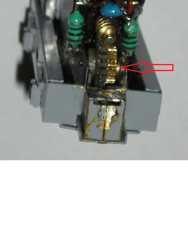 1. Všimol som si, že v problematickom smere sa šnek a šnekové ozubené koleso (biele) do seba zahryzávájú, preto som na opačnú stranu (k mosadznému ozubenému kolesu) vložil dištančnú podložku - treba plechy pojazdu trocha roztiahnuť, pinzetou umiestniť podložku a plechy zasa stiahnuť (samozreme pri obidvoch šnekoch). Jazda sa tým aj v smere kabínou vpred stala rovnako dobrá.