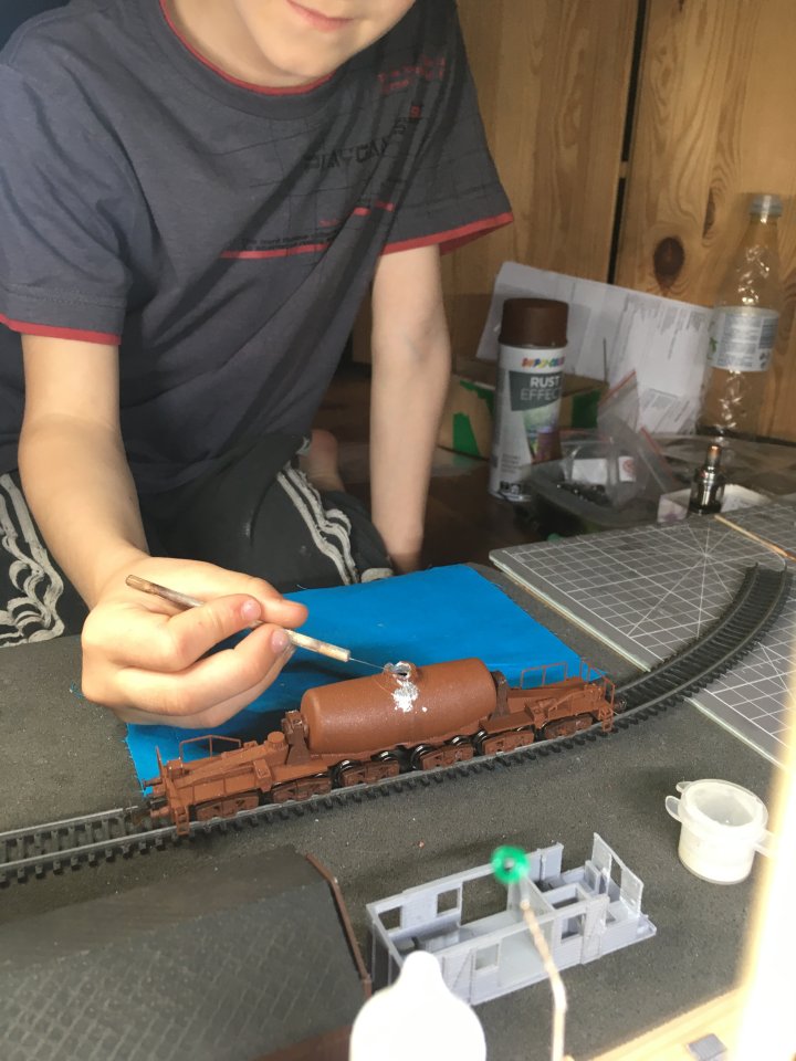 . Tamiya stříkací pistole mu celkem jde. Hodně o stříkání jsme vyčetli na stránkách od Mnitky. Kolejiště ho moc nebaví, spíš chce stavět vozidla. Tak máme jen malé, víceméně zkušební.