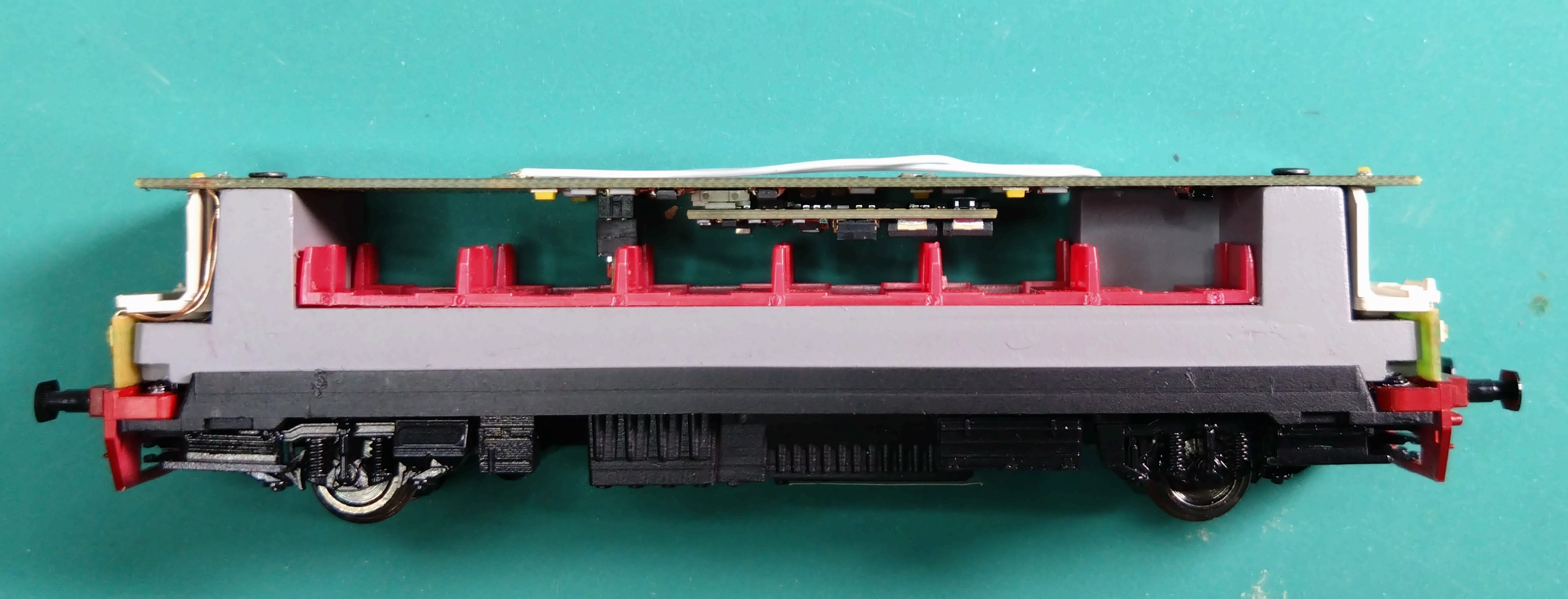 Z bočního pohledu je vidět, že místa je tam dost, je jen na Tobě, kolik chceš obětovat z průhledu vozem. Ale zmíněné Goldcaps 0,47F, když se umístí zespodu na desku, nejsou vyšší než dekodér a vejdou se v pohodě nad opěradla sedaček. Každopádně, STACO, resp. nové dekodéry ZIMO řady MS je vynikající "vynález" a nepřemýšlel bych o jiném řešení. Jízda je naprosto luxusní. Upravil jsem podobným způsobem třeba Rosničku, která nemá dobrý sběr proudu - a je po starostech. V tomto případu jsem použil dekodér MN170N + modul STACO 03. Pokud budeš potřebovat další informace, rád předám (pokud budu vědět).