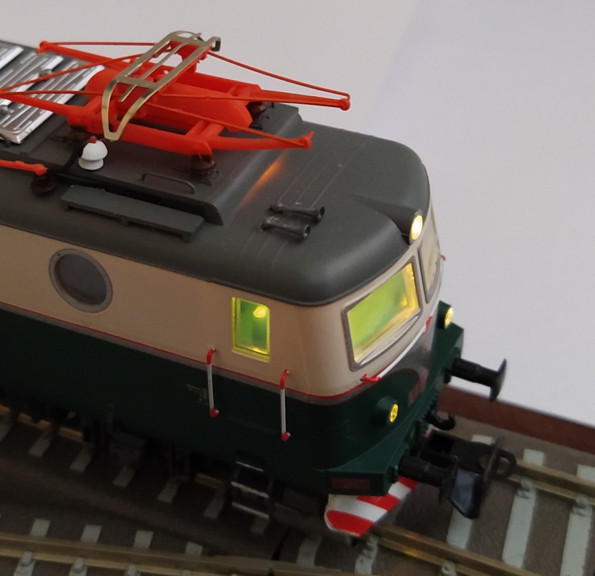 Dík za odpovědi, jezdí to pěkně. V analogu nulka na čtyřiceti cm stáhne náskok jedničky cca 5cm. Víte co je pro zarytého vyznavače analogu to nejhorší?. Nevíte? ....No že musí dát do svojí mašiny DCC dekodér, aby mohl nafotit jak svítí :lol: Stejně v analogu svítila, tak nějak kulturnějc. Ano je to dáno stejnosměrným napětím v koleji. A navíc protože "jezdím" tak 8 max 10V jas je mírnější a hlavně neprosvítá...ne kolem světel ale střechou. :roll: a ještě sem teda doplnil červenou linku kolem střechy stanoviště
