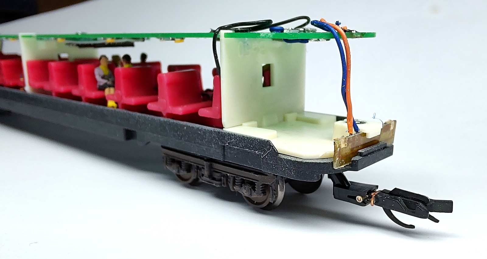 Model byl kupodivu vybavený deskou osvětelní, ale už ne sběracími plíšky. Ty jsem si tedy vyrobil a osvětlení jsem se rozhodl vzít zatím na milost. Originál vůz má osvětlení řešené pomocí zářivek ve středu klenby stropu, poměrně vysoko nad sedadly. Co vedlo MTB k tomu, že použili celoplošnou zelenou desku ve výši zavazadlových polic s teple bílými LED umístěnými na bocích za každým druhým meziokenním sloupkem, to ví asi jen bůh. Osvětlení v nástupních prostorech pak chybí úplně... Takže do oválných děr v desce spojů, které jsou cca v místě dveří, šly aspoň dvě další LED se svými odpory. Kdyby se někdo trochu zamyslel, mohl by vymodelovat o něco vyšší přepážky, celou desku s LED šoupnout o cca 4 mm výše, aby se dekodér ještě vešel nahoru, dát tam jednu řadu různě bílých LED pro simulaci stárnoucích zářivek a ještě by se dalo krásně vymodelovat charakteristická zešikmená okna v přepážkách. Takhle je tam jakýsi plastový dekl s dírou namísto prosklených dveří. Originál k vidění zde: https://www.vagonweb.cz/fotogalerie/CZ/CD_050.php