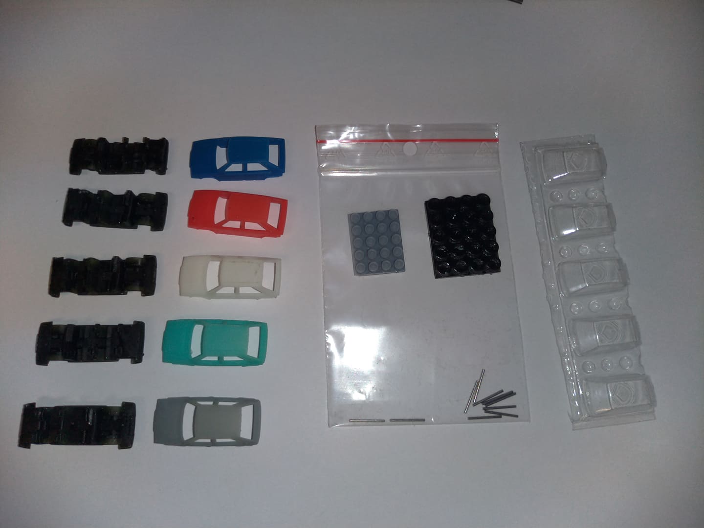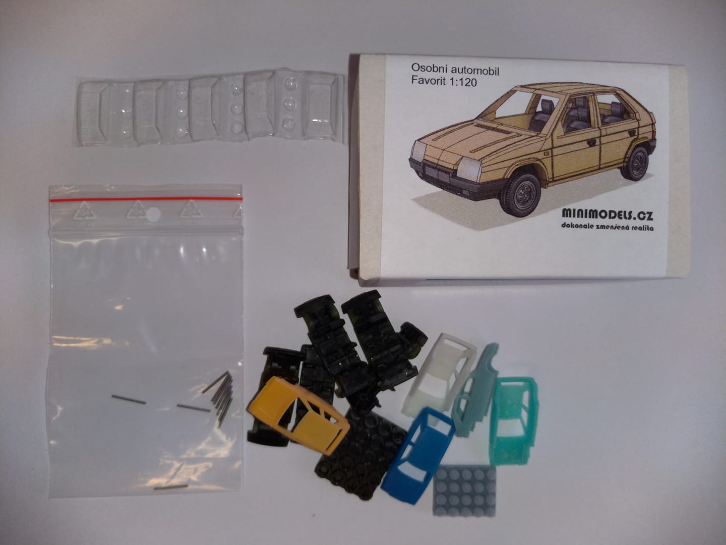 Obsahuje díly na sestavení 5 kusů Favoritů včetně pneumatik, zasklení, kovových hřídelek. Barvy karosérií v balení jsou zcela náhodné a mohou být třeba i všechny stejné barvy. Stavebnice neobsahuje návod. Sestavení je jednoduché. Možná časem udělám videonávod na youtube, zatím to vůbec nezvádám.
