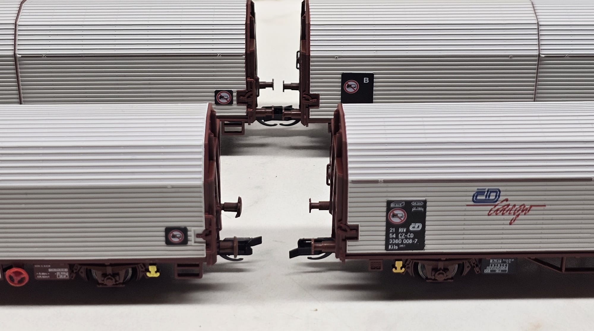 Jinak za mě ke Kils-ům či časem Laails-ům - také bych nepohrdl několika kousky do soupravy, ale nevím, ta stříbrná mi na modelu příjde příliš "křiklavě". Stejně tak stříbrný kotel vozu od PIKa VTG Zacens 47782. Pohledově lepší mi příjde matná stříbrná na modelu vozu Zacens 47783. Ale beru argument, že v reálu tam takový či makový RAL je. Limitkový model vozu Kils se starým logem ČDC je k dispozici u DS model-u a dle vyjádření prodejce byl zvolen jiný stříbrný odstín coby imitace změny odstínu po nějaké době provozu. Jak jsem se již zmínil, pro mne škoda i těch kulatých nárazníků u obou vozů. Ale kdo bude chtít, jejich výměna by samozřejmě nemusela být složitá. 8)