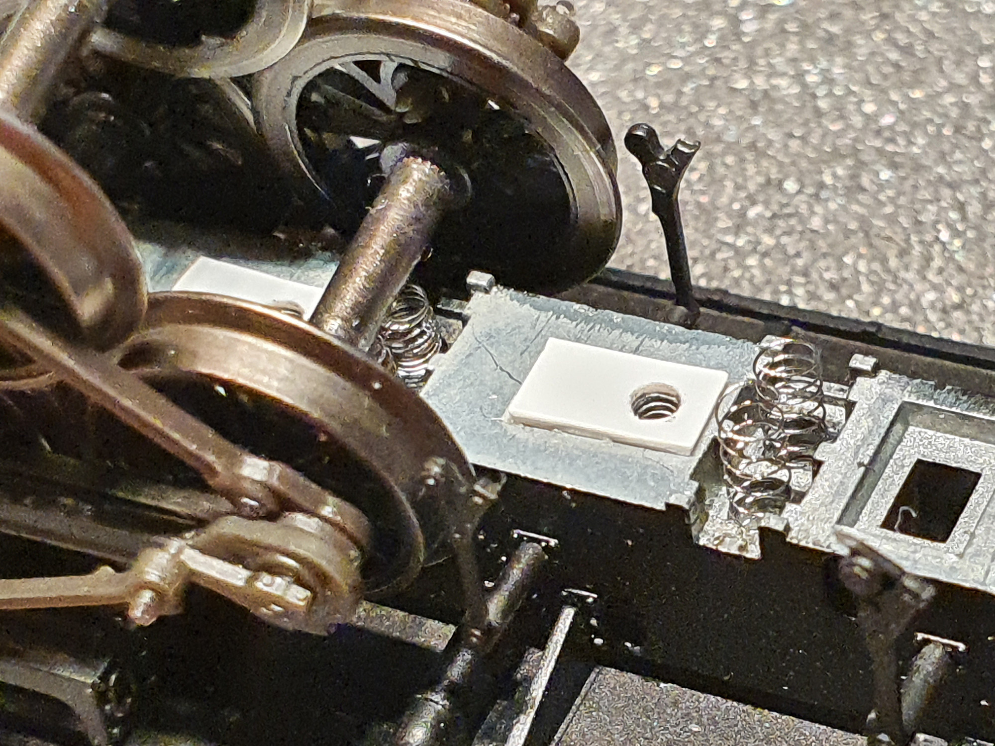 Asi před týdnem jsme s jedním šikovným modelářem z Prahy na fb řešili nedostatečný sběr proudu u tohoto jinak pěkného modelu. Je to trošku zarážející, když má lokomotiva pět náprav, které jsou bez bandáží a všechny jsou osazeny sběrači. První a pátá náprava je pevně usazená v mosazných kluzných pouzdrech. V kovovém rámu lokomotivy jsou z výroby připravené dva válcové otvory nad každou vnitřní nápravou. (druhou až čtvrtou). Soudruhům z NDR se zřejmě zdálo moc práce připravené otvory osadit pružinami, a proto se vnitřní nápravy při jízdě zasunou nad úroveň krajních náprav a tím pádem vůbec neplní svou funkci pro sběr proudu. Naštěstí onen modelář P.B. vymyslel nápravu tohoto problému tvorbou vlastních jemných pružinek z 0,1mm tenkého drátu, které se vloží do prázdných otvorů a vnitřní nápravy tlačí ke kolejnicím a mašina konečně jezdí bez výpadků. Musí se ještě mezi těmito nápravami vlepit na rám podložky z cca 0,5mm tlustého plastu, které zajistí vůli pro jejich pohyb ve vertikálním směru. Celá tato operace bohužel vyžaduje skoro kompletní rozborku lokomotivy, která díky osazení spoustou jemných detailů není zrovna uživatelsky přívětivá. Už teď se těším na další model, který budeme opět muset naučit jezdit.