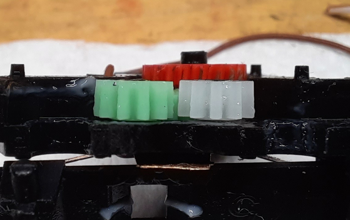 Nie som odborník na prevody, ale myslíte, že takto vyhnuté kolečka boli úmyslom inžiniera? Toto myslím je dôvod trhania mojej nepodarenej M275. Samotné prevody idú lahko, problém nastáva, keď sa osadia dvojkolia na ktorých sú ozubenia rovno. V určitom momente otočenia dôjde k vytočeniu dvojkolí v drážke, tým pádom k vačšiemu odporu a trhnutiu.