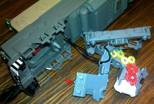 Včera jsem se pustil do zkoušení a záběhu této lokomotivy. Nemám teď kolejiště, tak jsem postavil malý ovál ze setu T334. V prvních chvílích vypadalo vše dobře. Najednou v Brejlovci luplo výrazně zpomalil, ale otáčky motoru se nezměnily. V oblouku se zastavil úplně. Kola prokluzovala. Zjistil jsem, že přestal fungovat pohon náprav jednoho podvozku, a to toho s bandážovanou nápravou. Vzpomněl jsem si, že tu kdosi něco psal o nedocvaknutých krytech převodů. Mašinu jsem tedy rozebral a opravdu u jednoho podvozku nebyl domáčknutý kryt převodovky, což způsobovalo že šnek vedoucí od motoru nezapadal do ozubeného kola převodovky. Chtěl jsem kryt domáčkout, ale vůbec to nešlo. Náseldovalo tedy další rozebírání. Zjistil jsem, že ani kryt docvaknout nelze. Vadil tomu nějaký výstupek. Asi zbytek po odlévání. Viz. foto. Byl jsem na vážkách, zda opravit nebo reklamovat. Nakonec jsem vzal jehlový pilník a výstupek upiloval. Díl byl spojen s lokomotivou drátky. Neměl jsem k dispozici páječku, tak jsem zbytek lokomotivy zabalil do papírového kapesníku, abych ho ochránil od pilin. Naštěstí materiál není tvrdý (asi dural), šlo to dobře. Potom jsem model sestavil. Další překvapení na mě čekalo, když jsem lokomotivu postavil zpátky na koleje. Nic, ticho jen svítila. Netočil se motor. Znova jsem to rozebral. Při rozebírání jsem asi přihnul jeden kontakt vedoucí k motorku. Tohle řešení mi nepřijde šťastné. Proč to také není spojené připajeným drátkem? Jistě by to bylo spolehlivější.